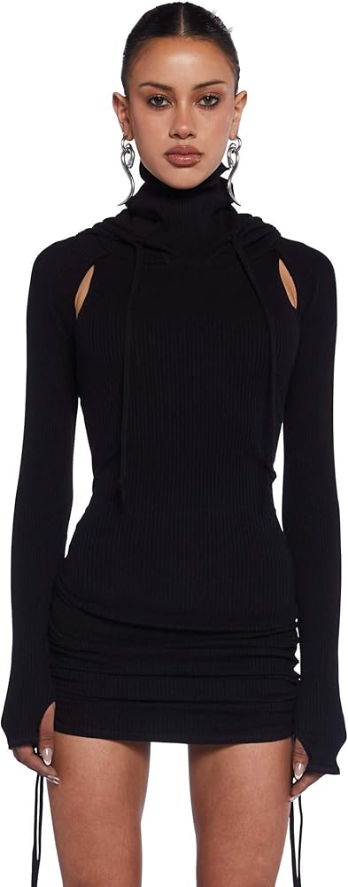 Elevate your streetwear wardrobe with the Dolls Kill Compression Ruched Mini Dress by DARKER WAVS in washed black. Designed for those who love bold, edgy fashion, this long sleeve mini dress combines streetwear aesthetics with a sleek, body-hugging fit. The ribbed jersey knit fabric offers a comfortable stretch, ensuring a flattering silhouette that moves with you. The hooded cowled turtle neckline adds a futuristic edge and can be pulled up as a face cover for a daring statement look. A racerback cut-out and embroidered ‘D' logo bring extra attitude, while long sleeves with thumbholes offer a sleek, sporty vibe. The adjustable ruched skirt lets you customize the length, making this the ultimate outfit for nights out, casual streetwear, festivals, or clubbing.