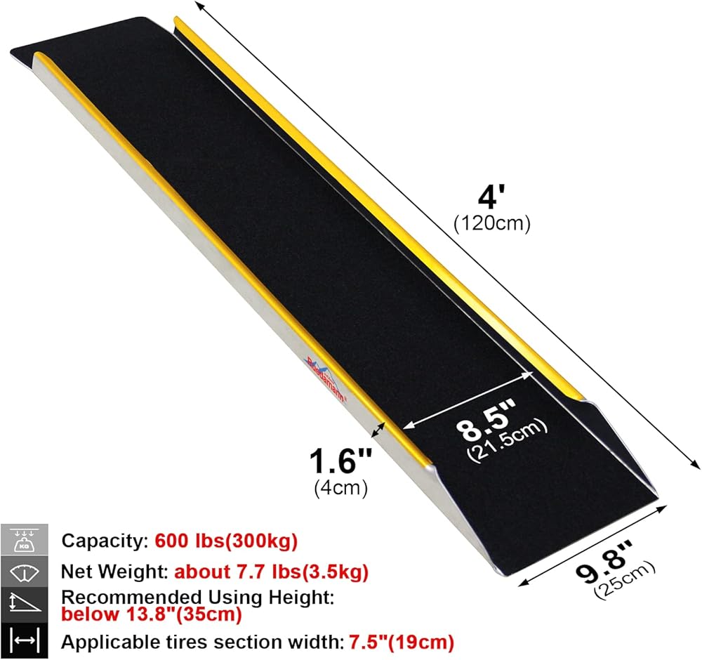 Maximum Capacity & Ideal Dimensions:This loading ramp supports up to 600 lbs 1PC, perfect for vehicles with tire widths up to 9.5" and ground clearance of 2"+. Dimensions: 48"L x 11 3/16"W x 1 5/8"H, ideal for ramps for sheds and ramps for trailers, with a recommended height of up to 13 3/4"