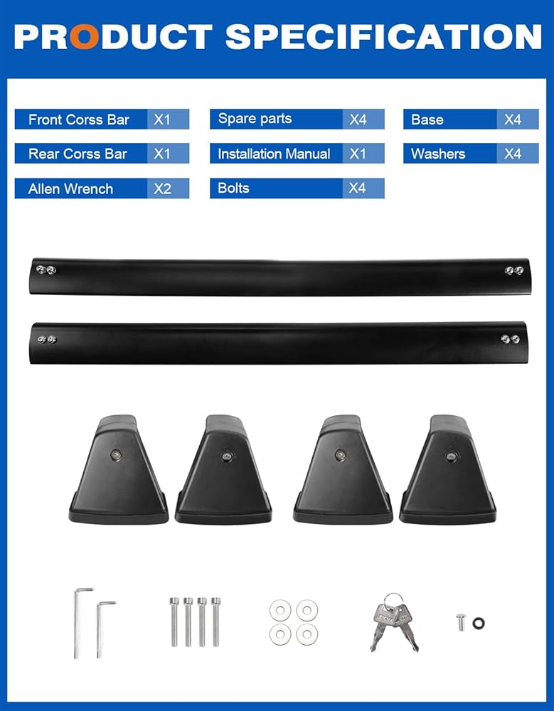 【Easy Installation】Absolute breeze to install and it fits like a glove. The easy direction + clear label on the product will provide great assistance to figure out how to install it. Package comes with a pair of crossbars, four mounting bases , screws, spare parts, installation tools and instructions.