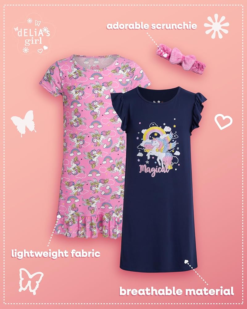 Make bedtime fun and comfortable with the dELiA*s Girls Nightgowns 2-Pack Pajama Dress Set with hair scrunchie, designed for kids who love playful prints and parents who love value. Each pack includes two super soft and cozy, short sleeve night gowns in a variety of colorful designs-perfect for slumber parties, weekend lounging, or winding down after a busy day. Crafted from lightweight, breathable fabric, these girls sleep shirts keep her cool, cozy, and comfortable all night long. The relaxed silhouette make them easy to wear, while the soft-touch fabric is gentle on sensitive skin. Whether she's sleeping, reading, or playing around the house, these gowns are made for all-day and night comfort. With fun, age appropriate graphics and vibrant colors, these pajama dresses add personality to her nighttime wardrobe. From unicorns and stars to playful slogans and dreamy patterns, there's something in this set to match every mood and style. A great option for families looking for girls' nightgowns, pajama dresses, or sleepwear for kids sizes 4 through 14. The roomy fit and pull-on design offer hassle-free changes, and the durable stitching holds up to frequent wear. Machine washable and fade-resistant, this set is built to last through countless washes-perfect for everyday use or as a gift for birthdays, holidays, or back-to-school prep. Whether you're looking for girls sleepwear, nightgowns for kids, or cute and comfy bedtime options, this 4-pack value set delivers quality and style in one fun set.