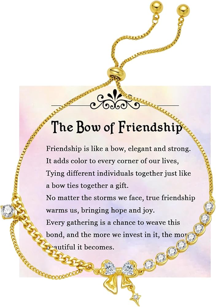 Bow Zircon Bracelet: The Bow Of Friendship Friendship Is Like A Bow, Elegant And Strongit Adds Color To Every Corner Of Our Lives,Tying Different Individuals Together Just Likea Bow Ties Together A Gift.No Matter The Storms We Face, True Friendshipwarms Us, Bringing Hope And Joy.Every Gathering Is A Chance To Weave Thisbond, And The More We Invest In It, The Morebeautiful It Becomes.
