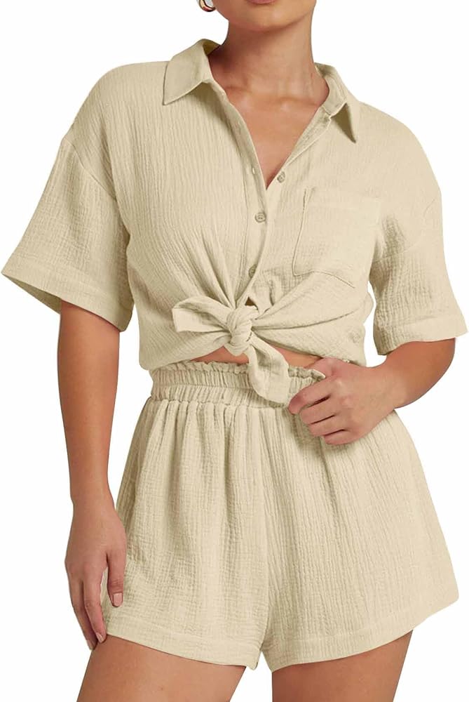 Design: Summer 2 piece sets for women include a button down shirt and paperbag shorts set, loose blouse shirts top, short sleeve, button front, chest pocket, cute high waist shorts, with elastic smocked waistband, resort wear for women 2025, comfy button down pajama set, beach cover up two piece set