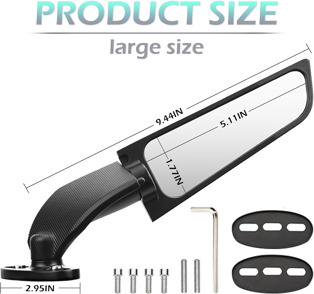 1. Fitment: It's a motorcycle rearview mirror that converts into an aerodynamic wing, designed for super sports bikes, replacement for Ninja 300 400 650 , etc.