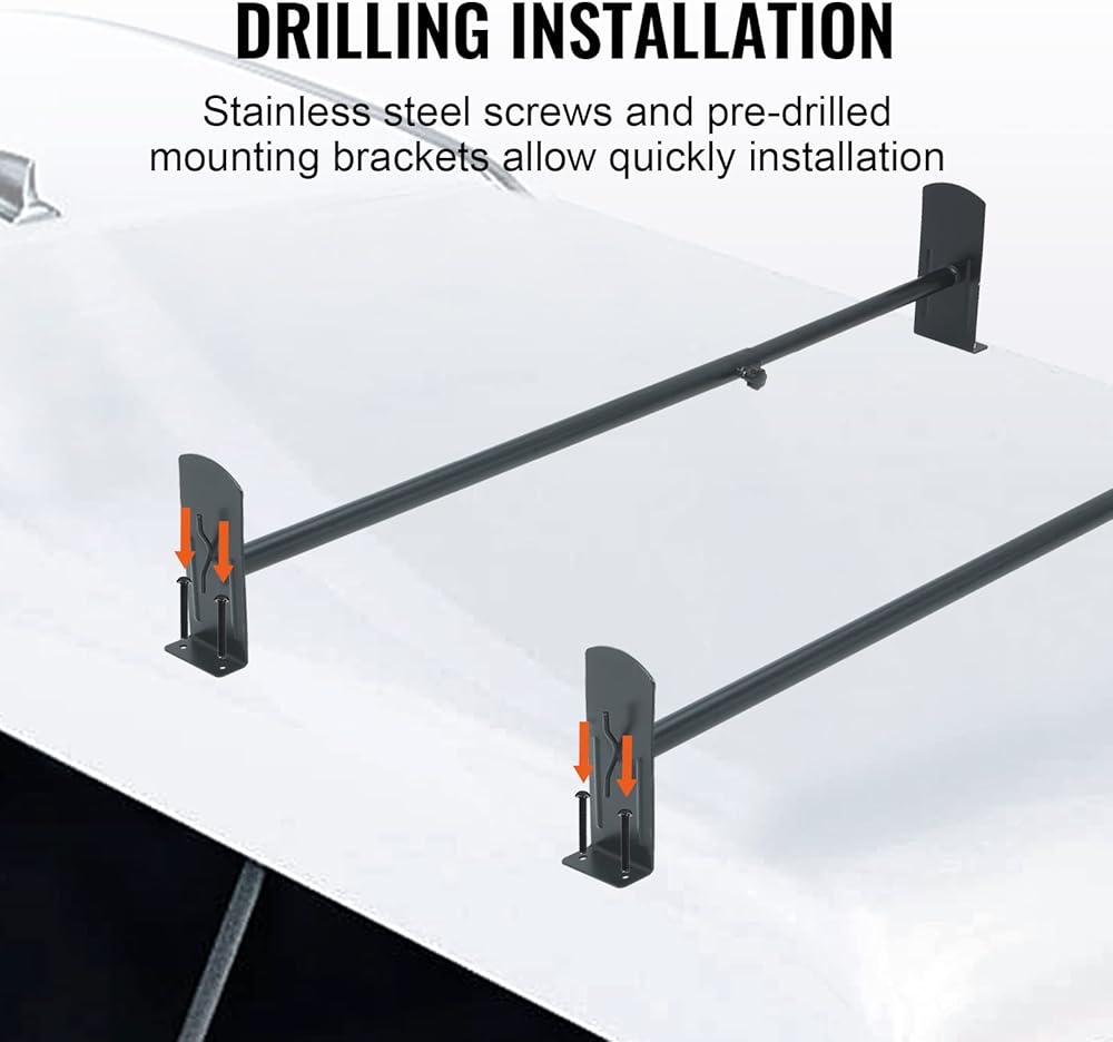 Alloy Steel Van Ladder Rack: Made of durable alloy steel, each single ladder roof van rack can bear up to 250 lbs, while two van racks can bear a total of 500 lbs. The robust construction provides powerful support and is resistant to deformation. It's the perfect solution for transporting long materials such as ladders, lumber, pipes, and kayaks on the roof of your van.