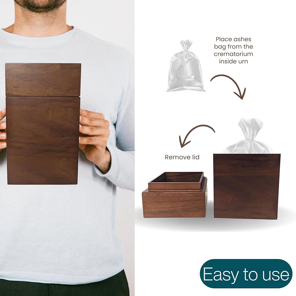 ✔️ | PROTECTION FOR YOUR LOVED ONE | With our large urn, soft velvet lining and soft black flannel bag, rest assured that the remains of your loved one are safe. This enables you to travel with your loved one or to keep them at home. Express your love for your family with a handcrafted walnut cremation urn, and give your loved one the quality they deserve.