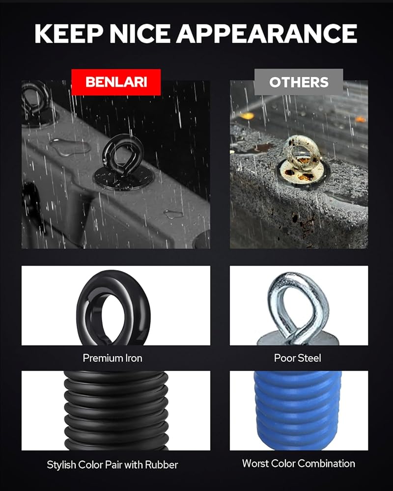 All Black Design, Keep Nice Appearance. Benlari tie down anchors are made of premium iron with gloss black finish. The stylish color of lock and ride anchors pairs with rubber to keep nice appearance.