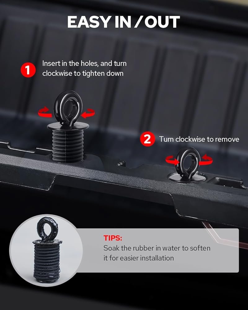 Package Included&Easy In/Out. Package includes 6 of 1 inch tie down anchors with 1 inch hole. It is easy to install and remove: insert in the holes, and turn clockwise to tighten down; turn clockwise to remove. Soaking the rubber in water helps better installation.