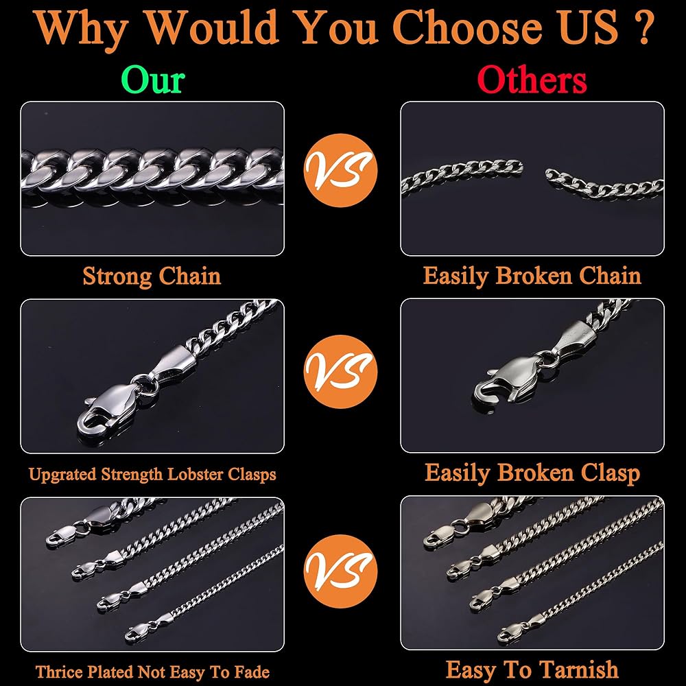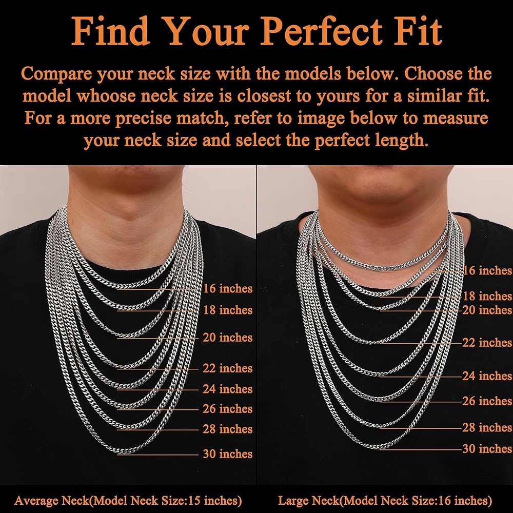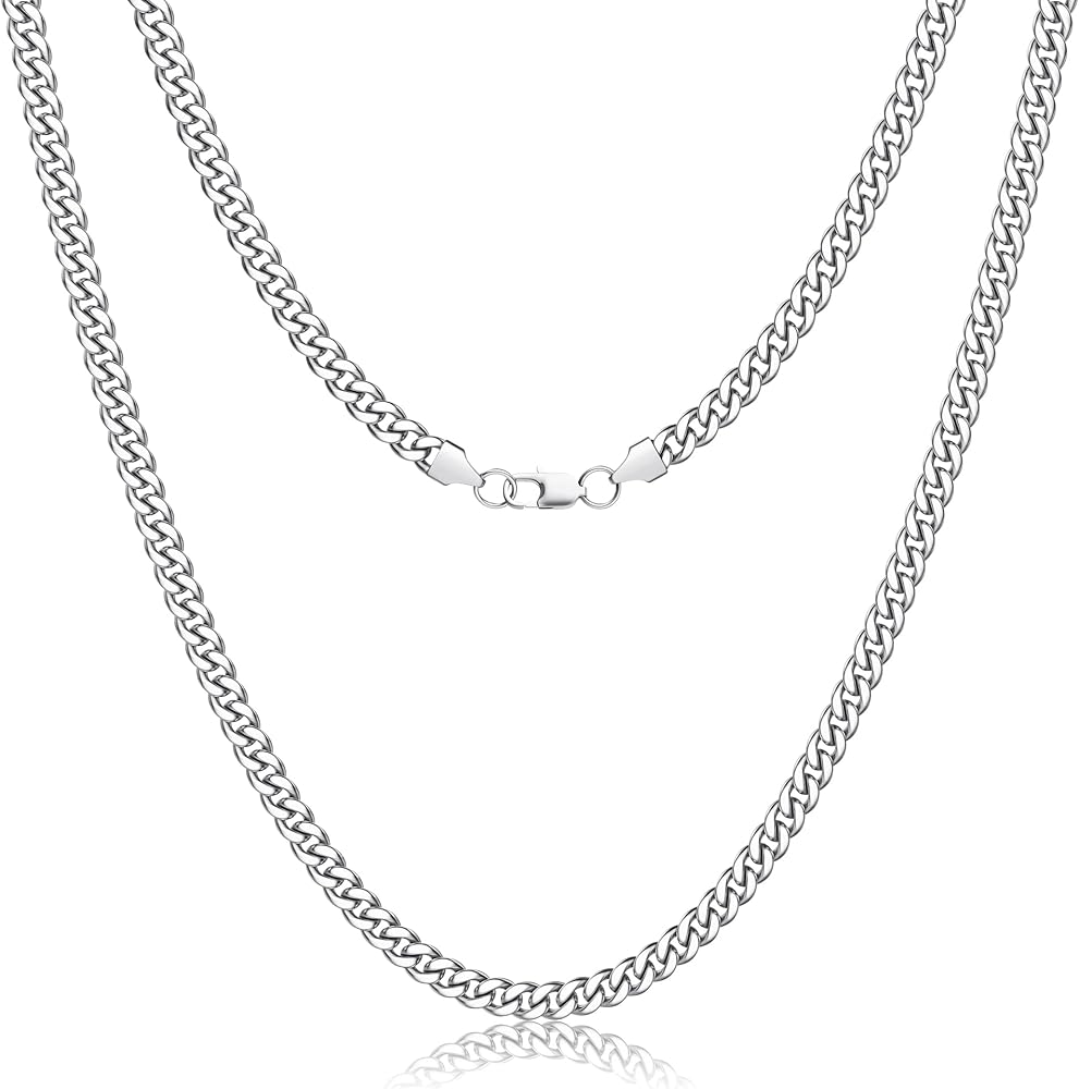 SKIN FRIENFLY MATERIAL: The chain necklace is made of 316L stainless steel, the chain comes with a easy-to-clasp lobster claw clasp is super durable and sturdy; the necklace has long-lasting color retention and wear resistance. Non-fading and hypoallergenic, friendly to sensitive skin. Unlike sterling silver chain, stainless steel chain necklace for men is the best choice for daily wear, indoor(showering) or outdoor sports(swimming, sweat), because of its excellent maintenance characteristics, such as heat-resistant, water-proof.