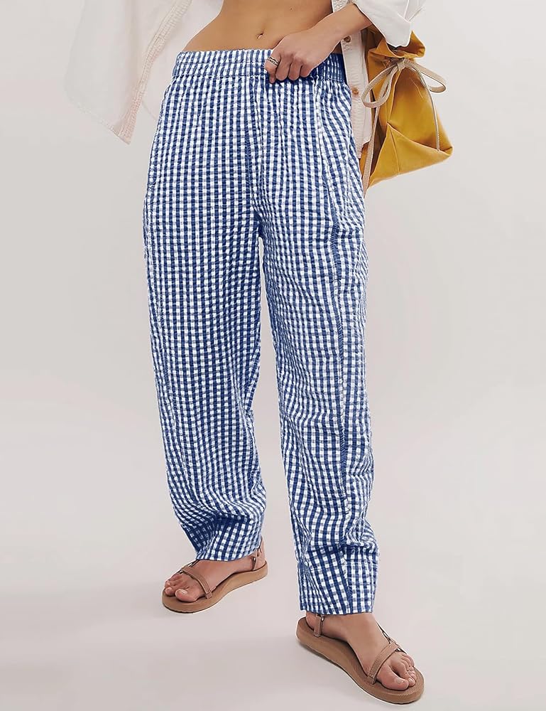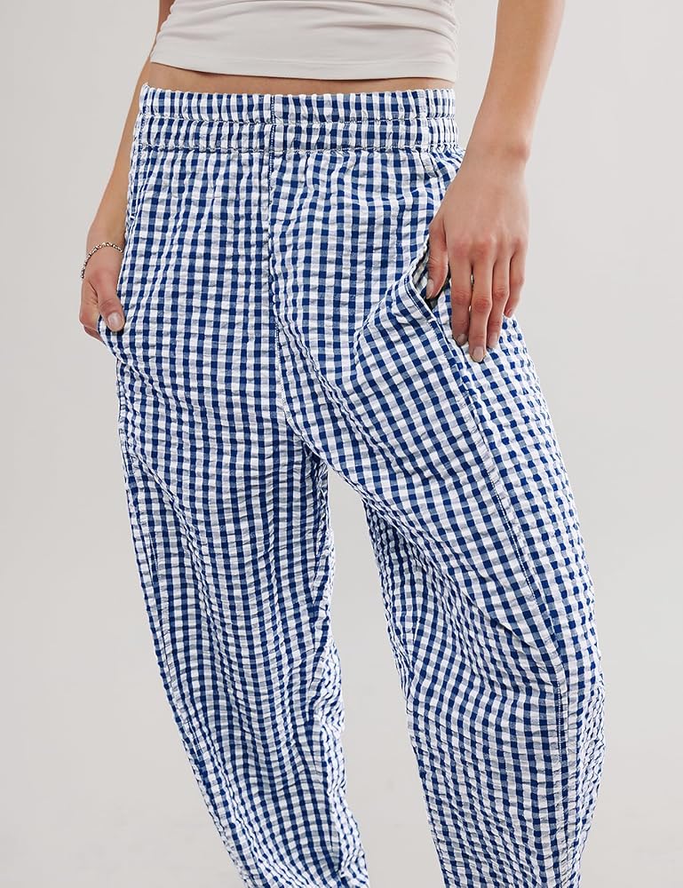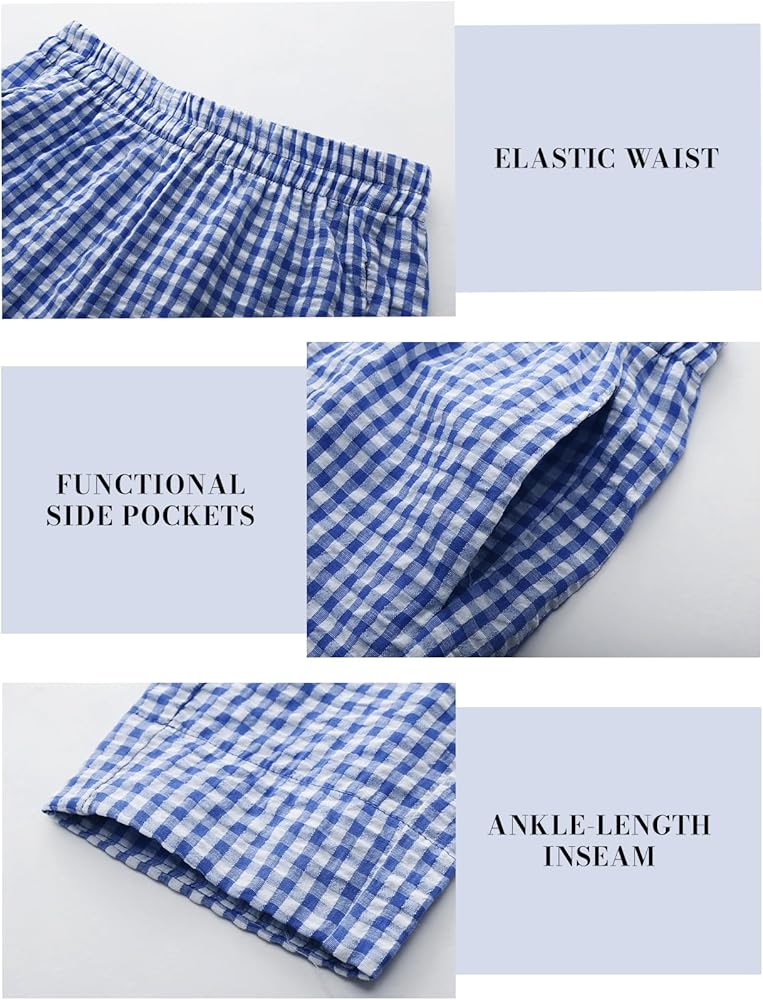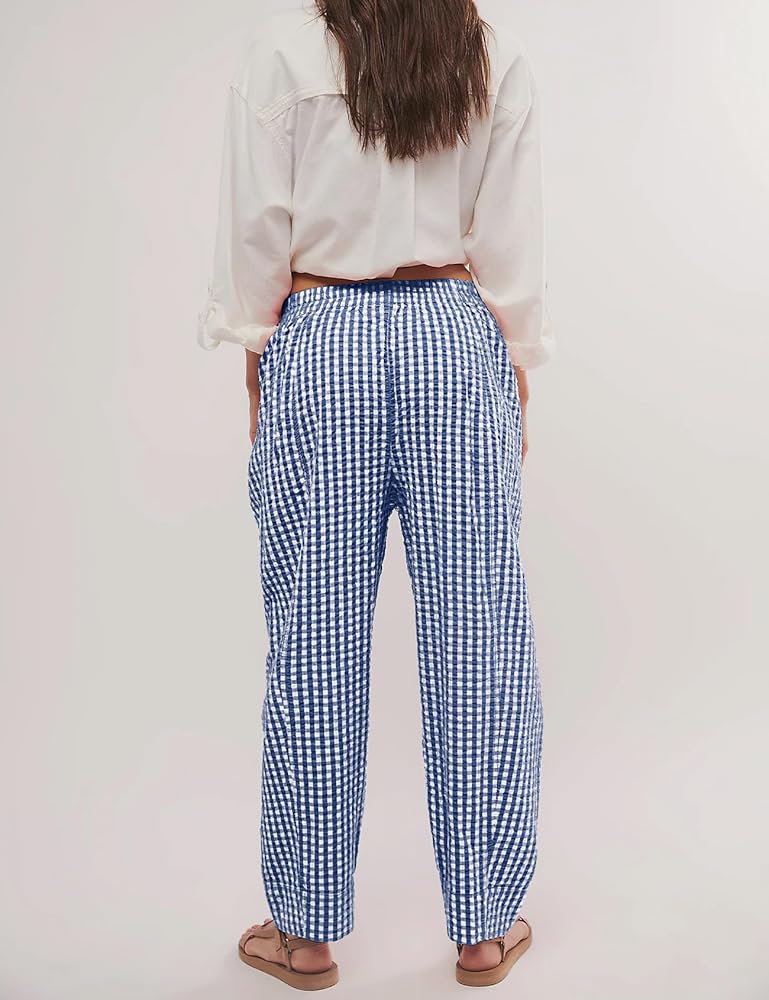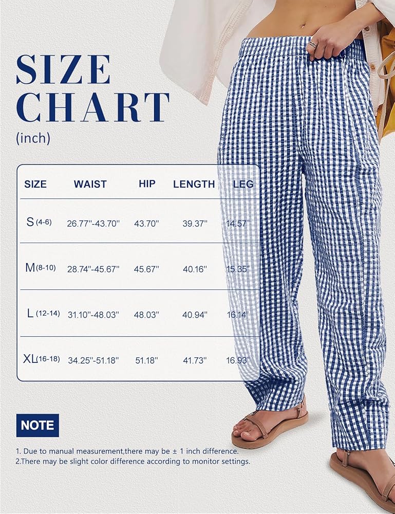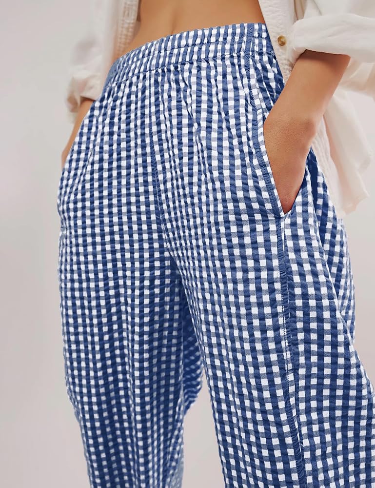 【Design】 These women's checkered pants feature a classic gingham print, a stretchy elastic waistband, wide legs, ankle-length inseam, and functional side pockets. These gingham pants blend style and practicality.