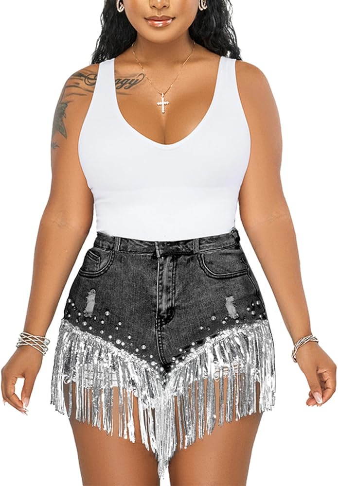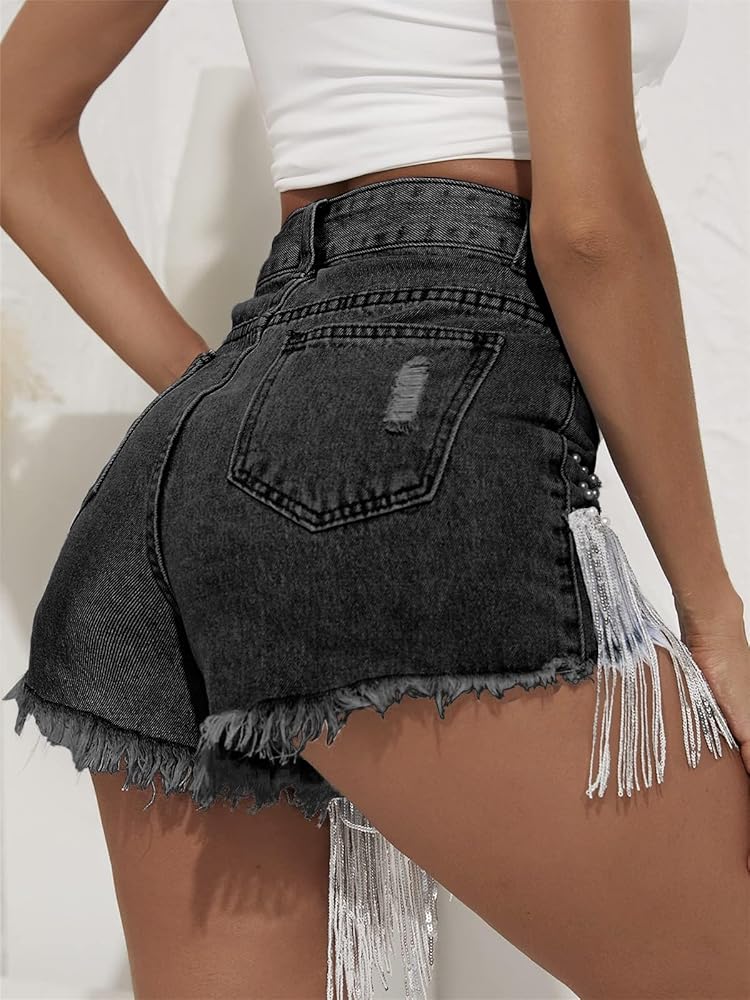 Easy to Match: Stretch jean shorts with rhinestone fringe. Match well with summer casual blouse, t-shirts for a casual stunning look.