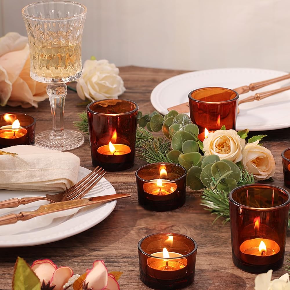 12pcs Assorted Amber Votive Candle Holders, Glass Candle Holder for for Fall Decor, Amber Tealight Candle Holder for Table Centerpiece, Wedding and Party Decor