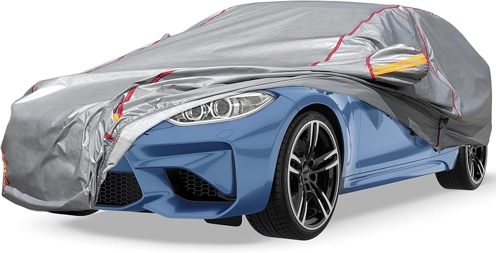 Multilayer Material: The car cover waterproof all weather is made of advanced materials with 6 layers of aluminum film, including non-woven fabric, PE, EVA and soft lining. These exterior materials are 100% waterproof. The highly reflective aluminum film has a good UV protection function. The reinforced aluminum film is used as a whole, so it will be more flexible and durable than other materials