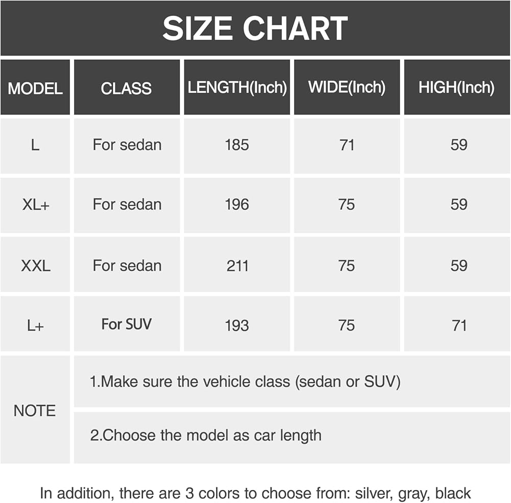 Choose the Right Model: Our car covers are spliced in two colors (black and gray), and come in four sizes suitable for both sedan and SUV. The outdoor car cover is applicable to sedan (non SUV Hatchback) with a length of 196 to 210 inches. It also comes with a portable storage bag for easy storage. Before purchasing, please confirm your vehicle size and select the corresponding hood model