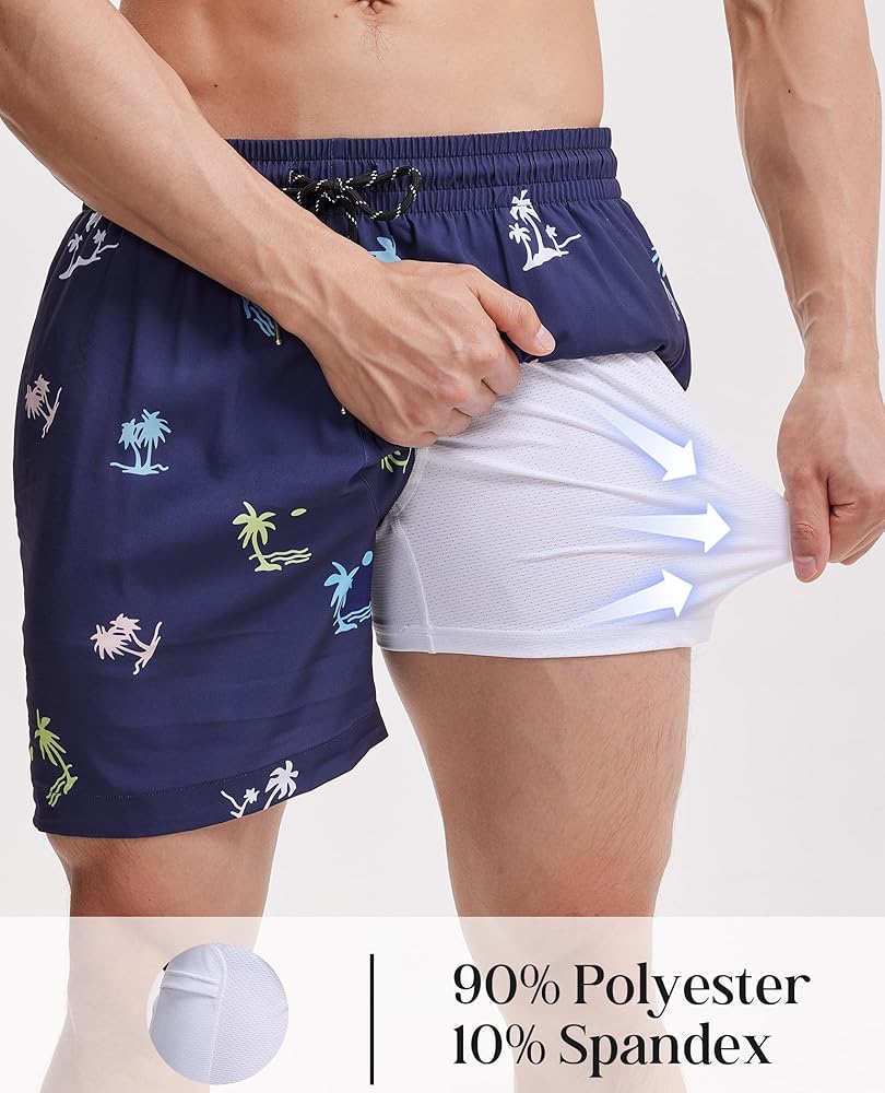 2 in 1 seim trunks men, Featuring a compression liner, functional phone hidden pocket, 5 inch inseam swim suit for men, elastic waistband with drawstring. Expertly strerchy swim trunks giving you a holiday Hawaiian look. It works well for almost anything you've got on.