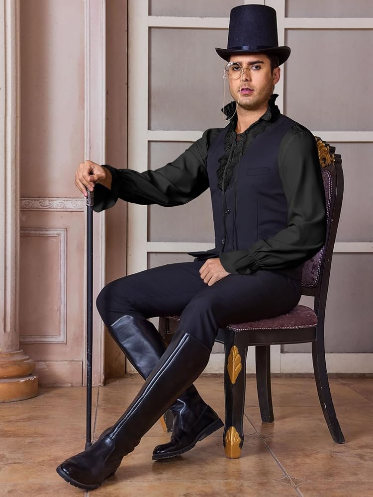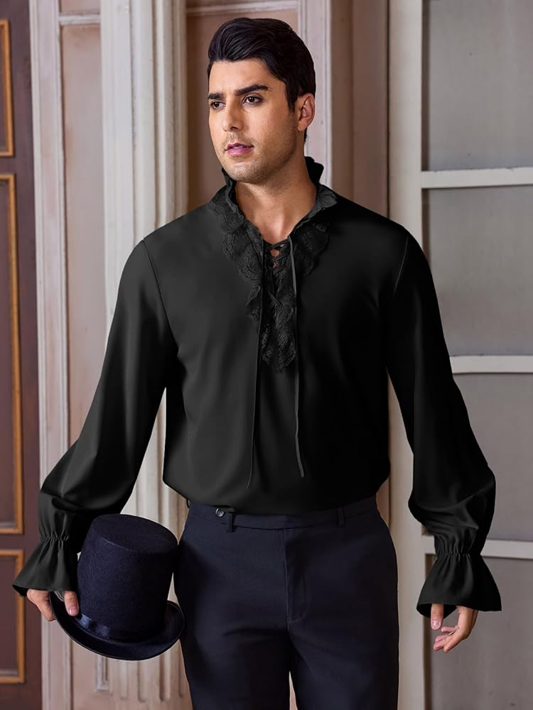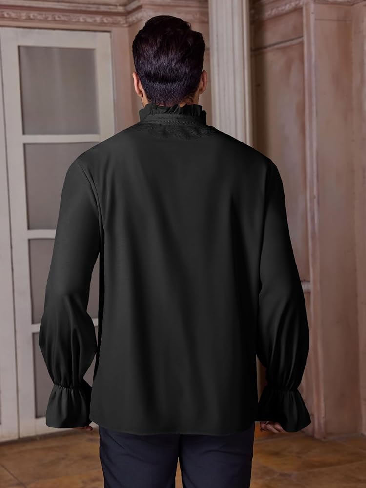 【Feature】 These mens Halloween medieval pirate cosplay shirts design with puff flared long sleeve, stand collar with pleated design, lace placket, ruffled front, lace up and steampunk gothic style. Medieval vintage style, adding an authentic touch to your pirate Viking, or Renaissance costume
