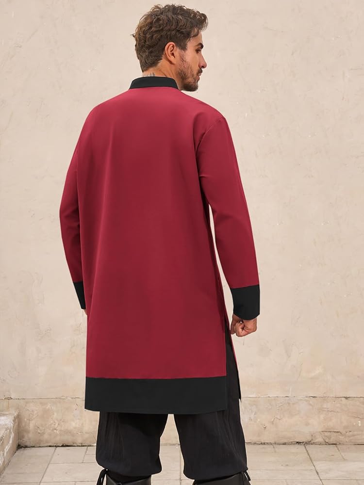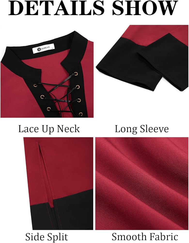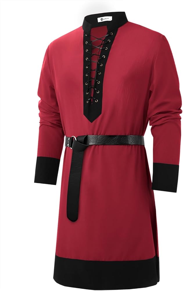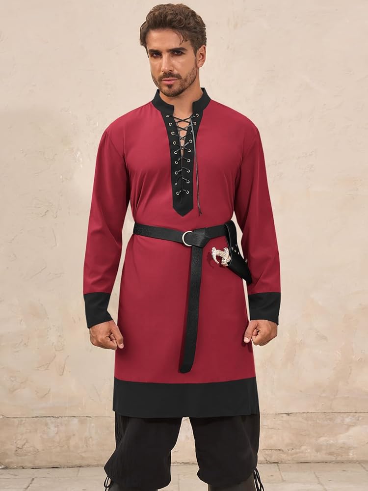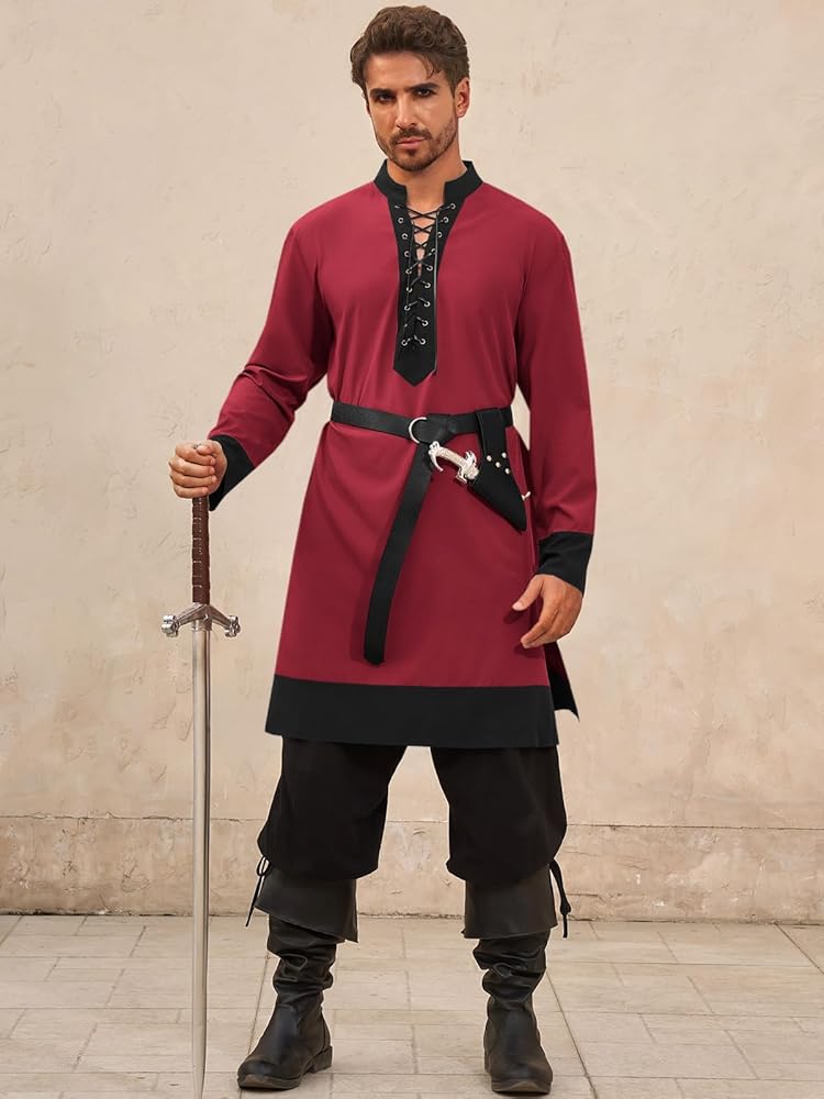 Features: Medieval viking long tunic tops with v neck, lace up, long sleeve, side split, contrast color ant neckline and hemline, unisex styles for men and women. NOTICE: The belt is not include.