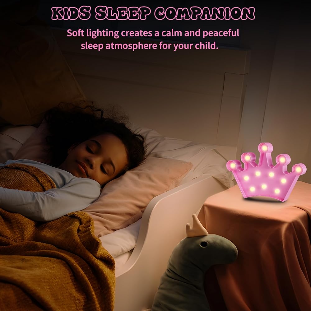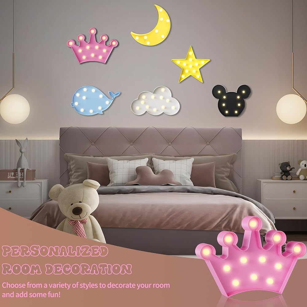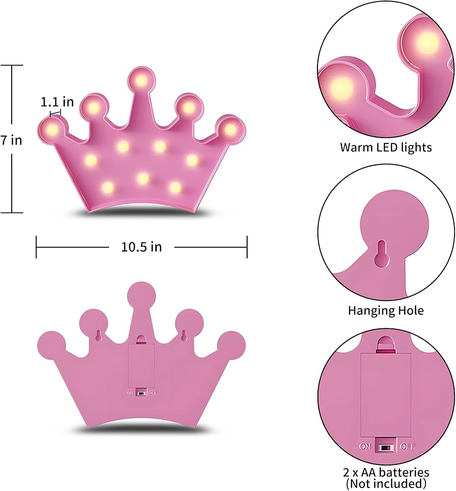 【Battery Powered Night Light】Powered by two AA batteries, this LED crown light is portable and easy to use. Hang it on a wall, place it on a nightstand, or take it on-the-go. Its warm, gentle light is ideal for kids night lights for bedroom or party decorations