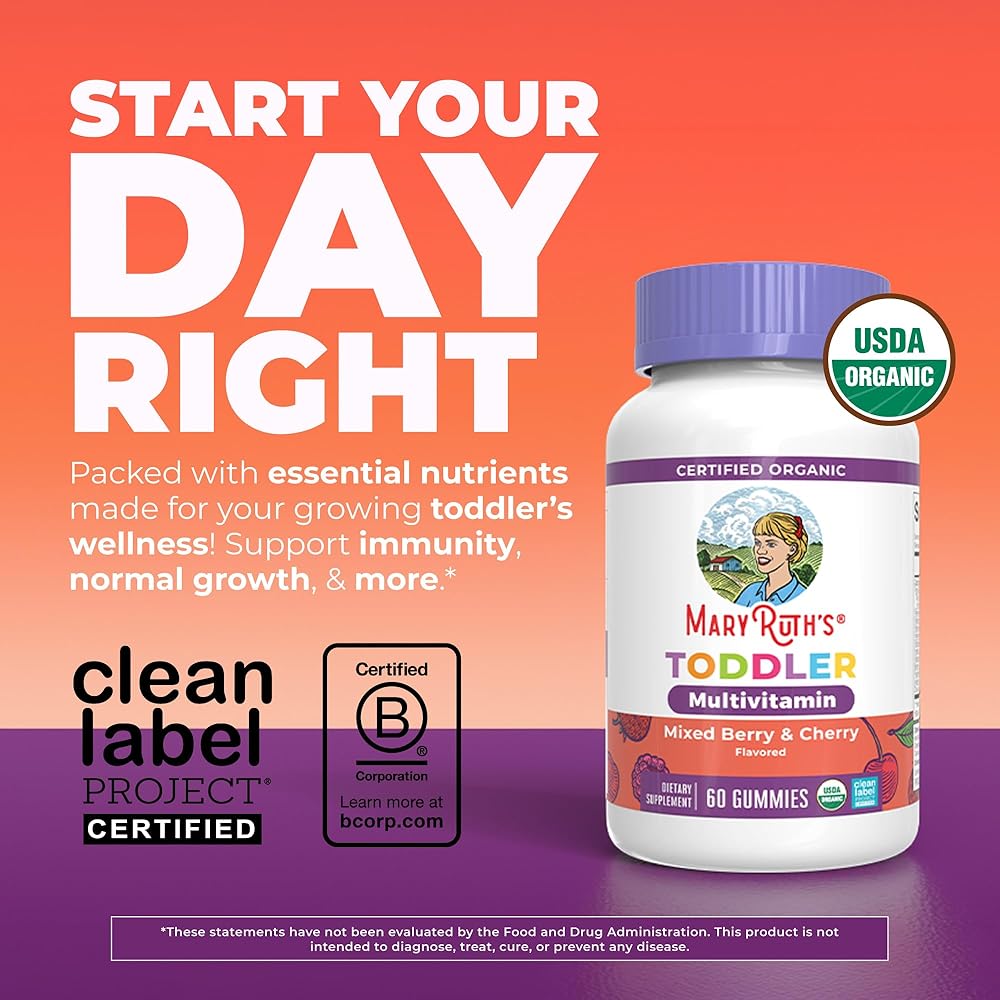 For Most Lifestyles: MaryRuth's Organic Toddler Multivitamin Gummies are USDA Organic, Non-GMO, No Gelatin, Pectin Based, Vegan, Made in a GMP Facility, Dairy Free, Nut Free, Soy Free. Clean Label Project Certified. B Corp Certified.