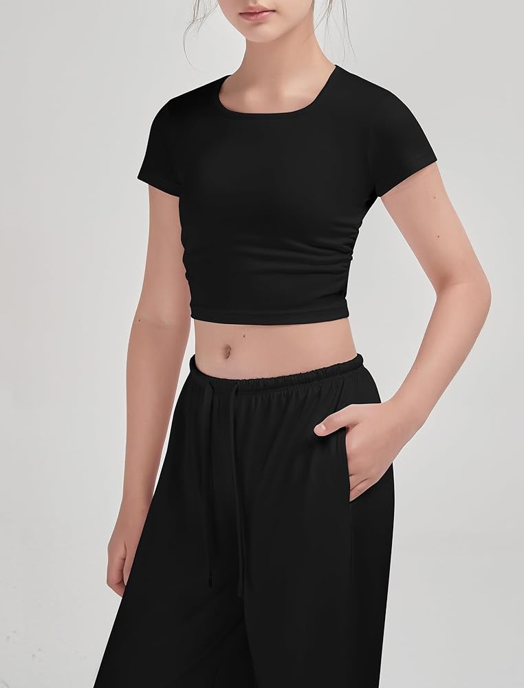 Unique design: The short sleeve crop top provides a relaxed and cool feeling in the hot summer. The drawstring can adjust the fit, which is convenient for daily exercise and sports. There are two pockets where children can carry some necessities