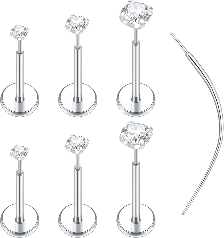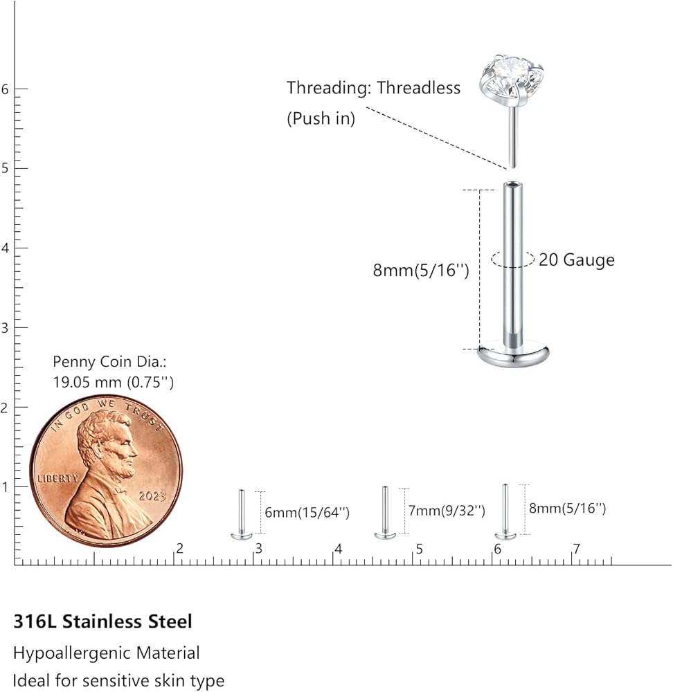Threadless Push in Nose Rings: Gauge size: 16G(0.8mm), Bar Length: 6mm/7mm/8mm, CZ Diameter: 1.5mm, 2mm, 3mm, Color: Silver. Material: 316L stainless steel. Package includes 6PCS labret posts (3 different length ), 6PCS threadless ends(3 different diameter ), 3PCS taper insertion pin. ONE LABRET POST TO FIT ALL THESE THREADLESS ENDS.
