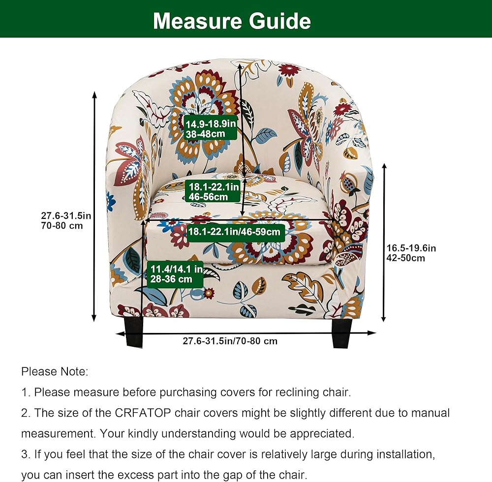 Upgraded 2 Piece Design: With upgraded two piece design, there is no need to worry about foam sticks popping out again, which means less trouble and cozier leisure. Also, high elasticity fabric and elastic band on the bottom will keep the armchair covers staying in place more firmly. Fit the tub chair width/height: 27.6-31.5in; seat length/width: 18.1-22.1 in. Kindly measure your club sofa before ordering