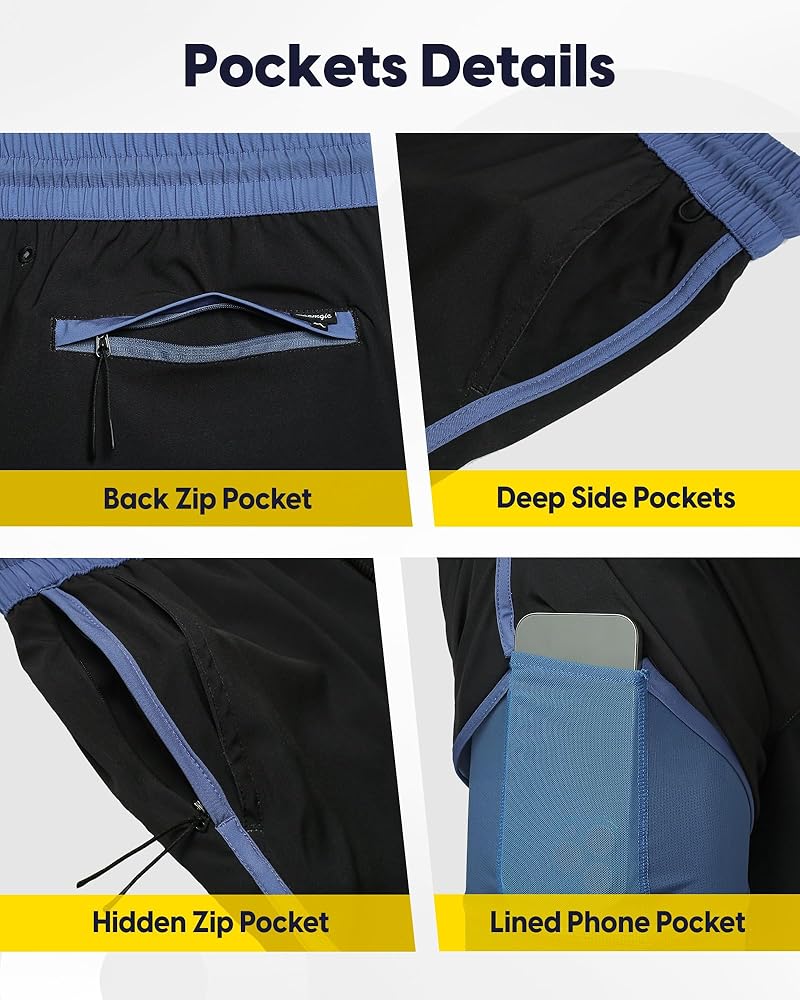 【Mulit-Pockets】: This running shorts for men include 2 deep side pockets, a back zip pocket and a side invisible zip pocket to locks down your belongs such as cash, cards, earbuds and keys, etc. Mens compression shorts also adds a lined phone pocket to keep your hands free during activities