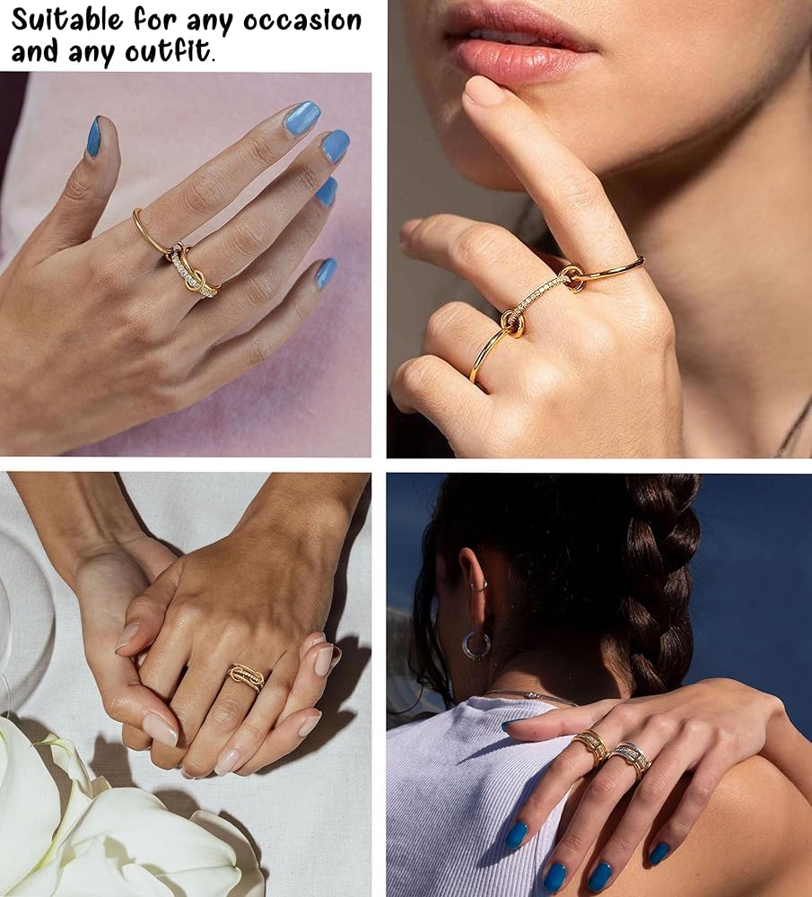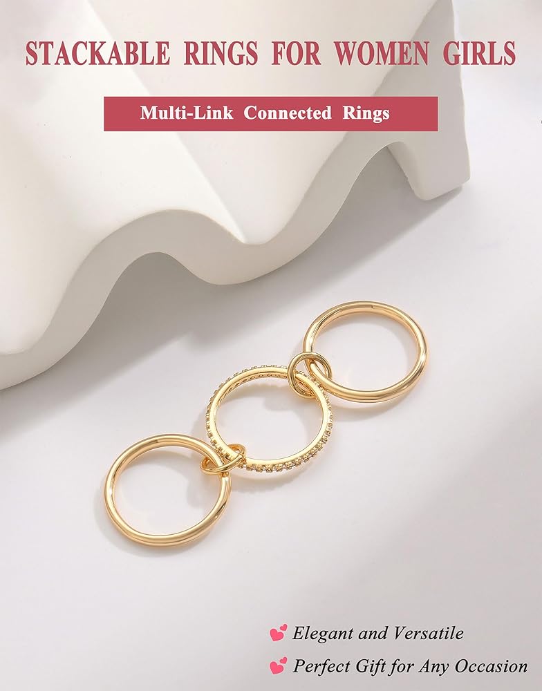 STACKABLE RINGS FOR WOMEN: This two tone ring includes two gold band rings and two cubic zirconia silver rings.All linked by a delicate gold jump ring. Feature interlocked designs that offer a unique take on stacking style. Stack them together or separate them to wear across different fingers.Interlocking loops symbolize love, friendship, and loyalty. Sparkling cubic zirconia stones add an extra touch of bling to elevate your look