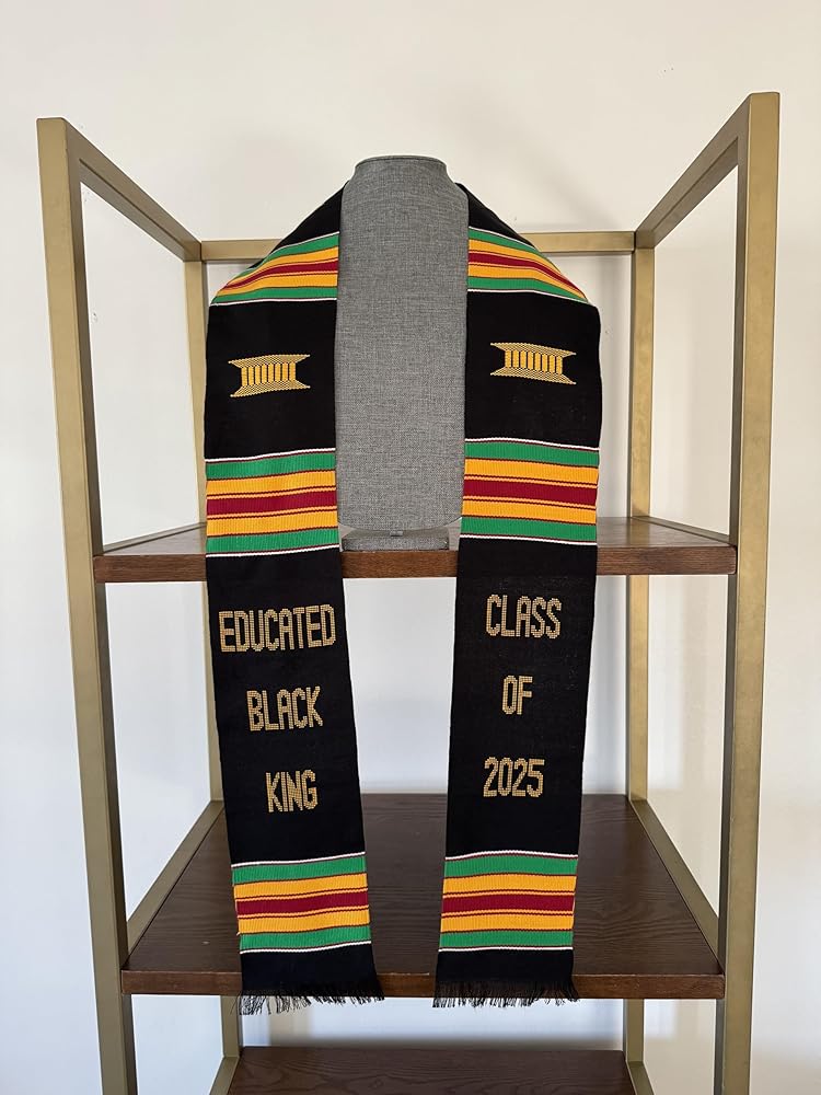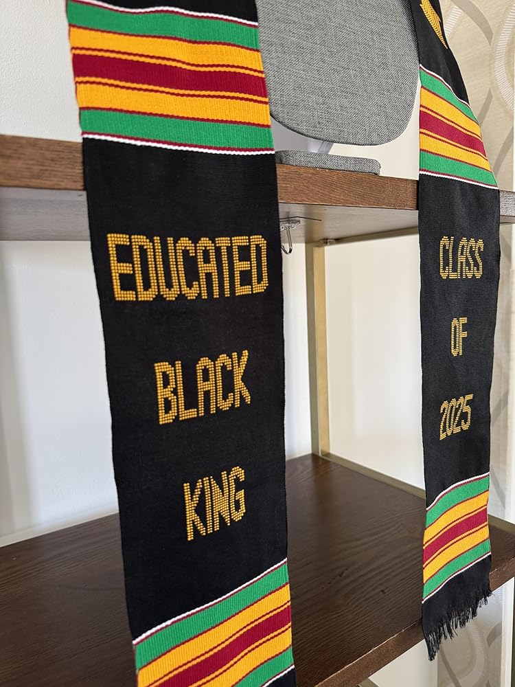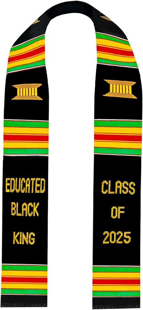 Premium Handwoven Kente Stole Educated Black King Graduation stole class of 2025. Our Kente Nursing Graduation Stole is an ideal accessory and a perfect addition to your commencement ceremony to showcase your hard-work and celebrate your achievement. This sash is made with high-quality RAYON fabric. Serve as a great graduation gift for a nursing graduate.