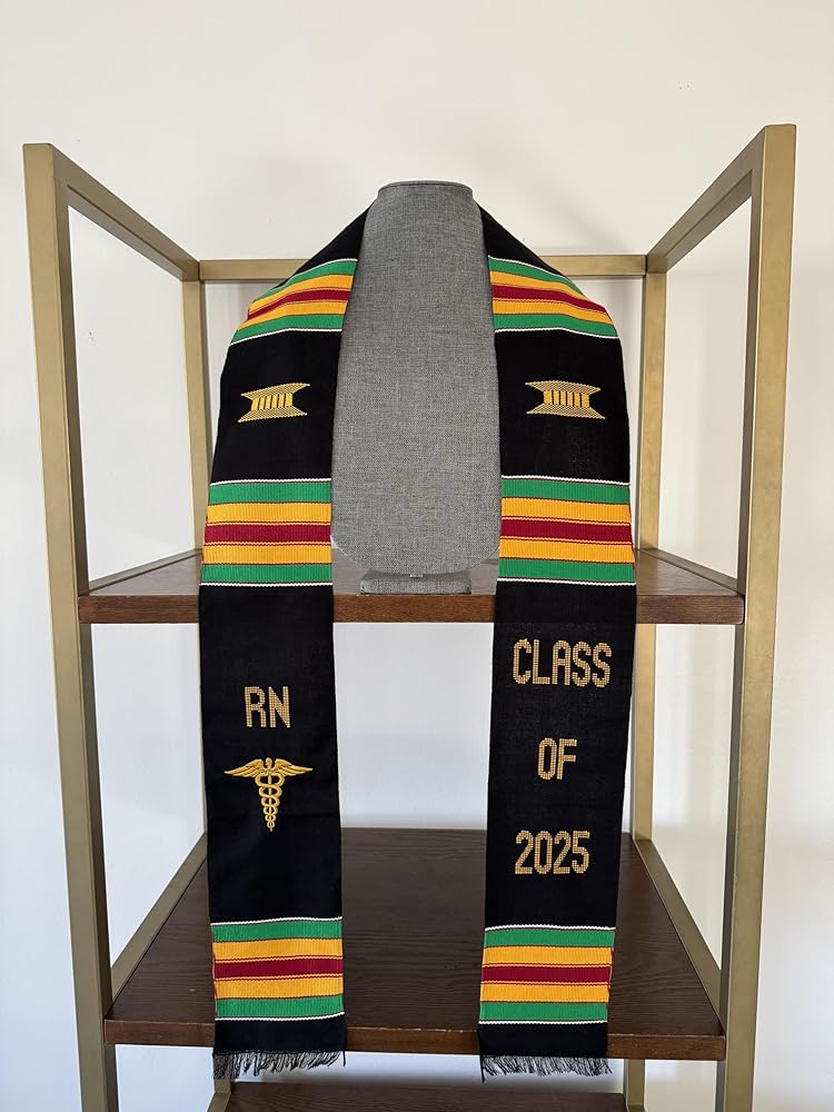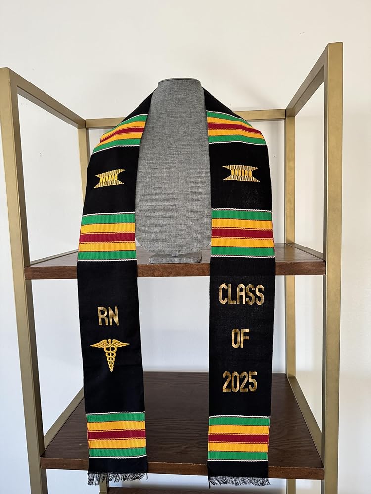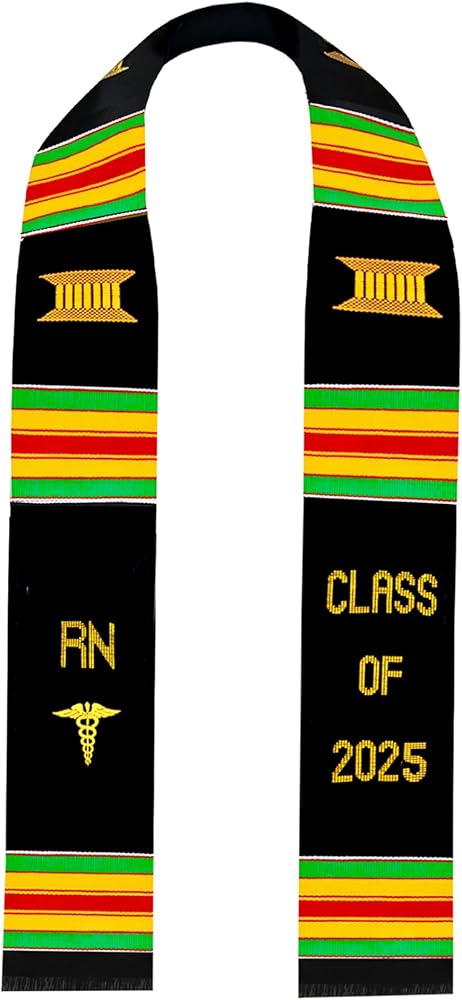 Premium Handwoven Kente Stole Nursing Graduation stole class of 2025 RN with medical logo. Our Kente Nursing Graduation Stole is an ideal accessory and a perfect addition to your commencement ceremony to showcase your hard-work and celebrate your achievement. This sash is made with high-quality RAYON fabric. Serve as a great graduation gift for a nursing graduate.