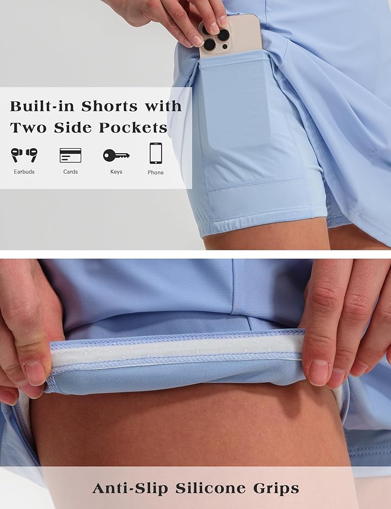Secure and Flexible Fit: This tennis dress includes built-in shorts and a detachable bra, offering full coverage and ease of movement. The shorts feature two side pockets for convenient access to essentials, allowing you to focus on your game