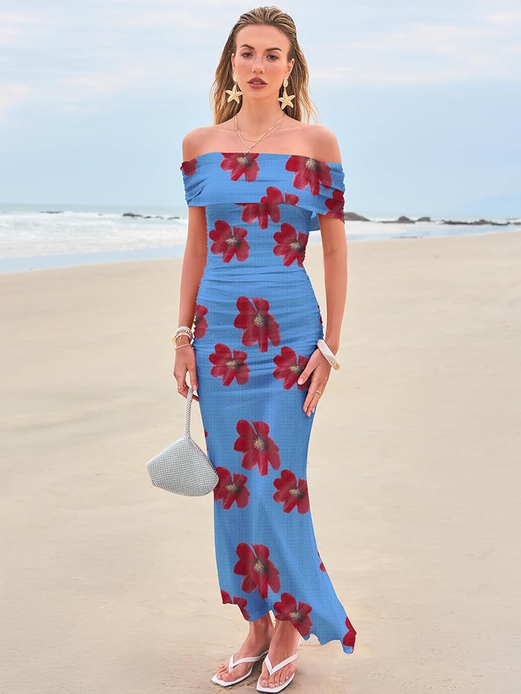 Designs: Off shoulder neckline, floral mesh dress, vibrant prints, long maxi length, back zipper, runched detail, lined, bodycon fit
