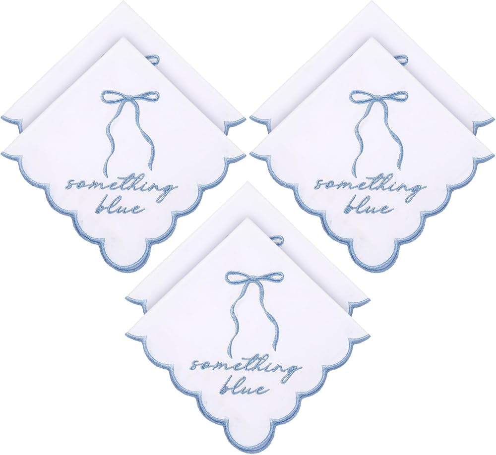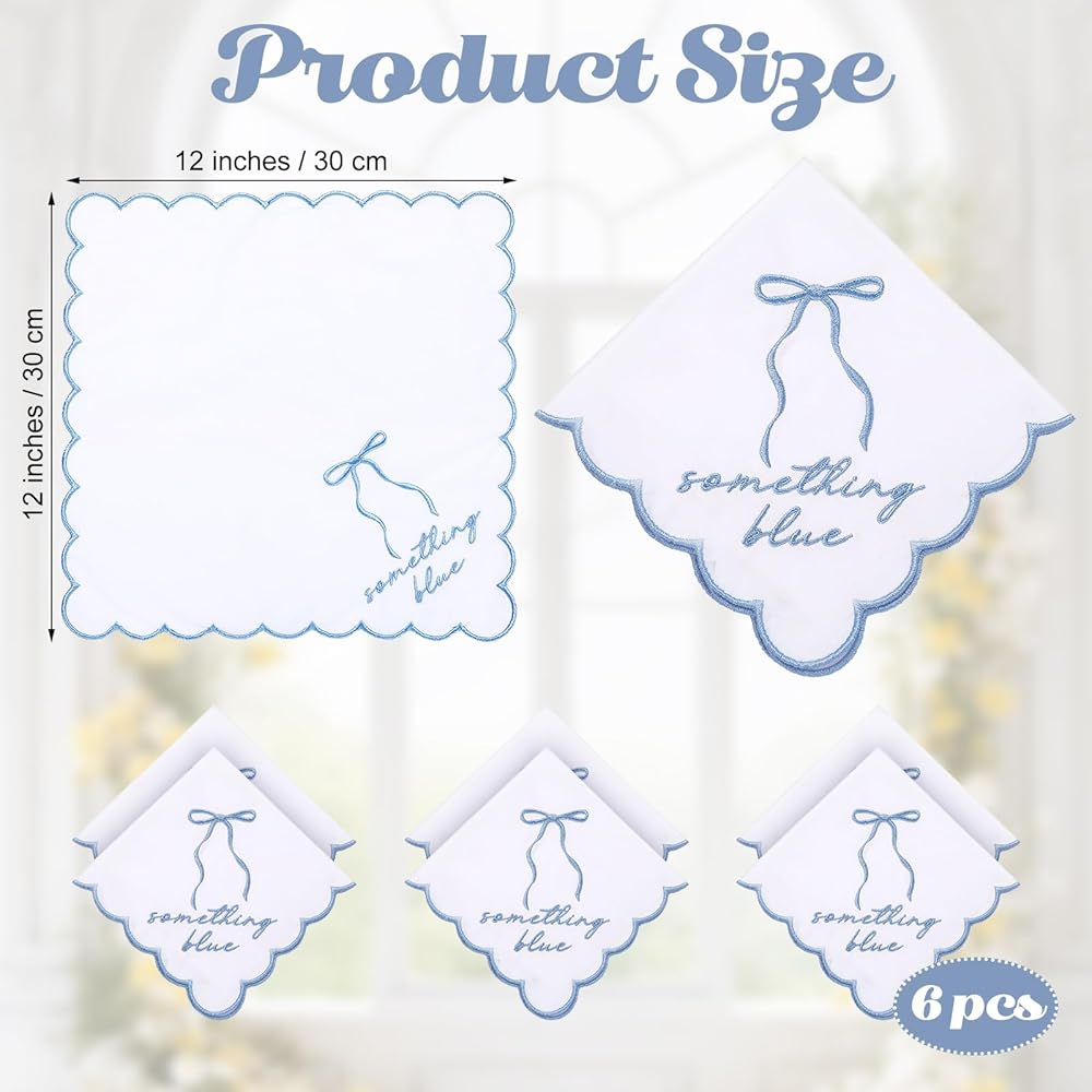 Package Content: the package comes with 6 pieces of wedding handkerchiefs, the classic white color coordinates with the romantic blue embroidered font, considerable amount and portable, the enough quantity and classic style of wedding handkerchiefs bulk will cater to your needs and replacement requirements