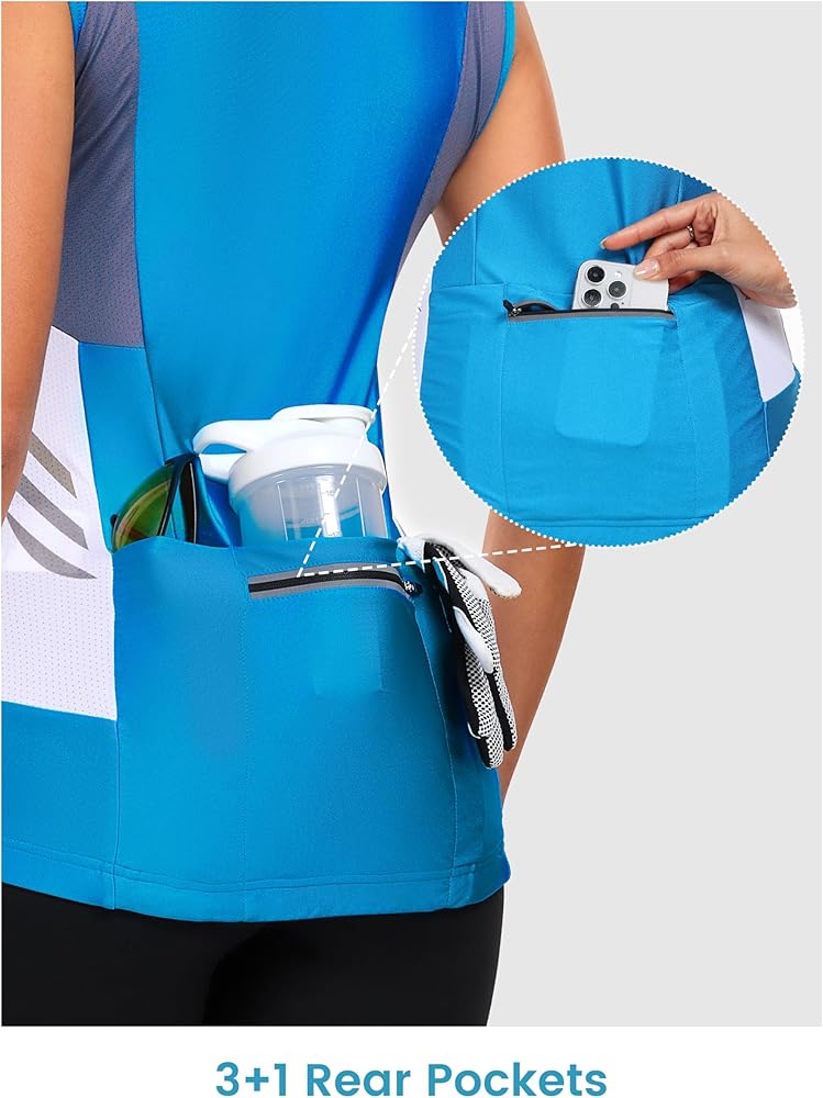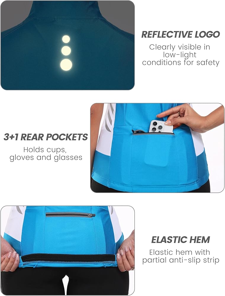 UTILITY POCKETS: 3 open rear pockets and 1 zipper rear pockets to hold your items like cards, smartphone and hand towel when cycling or running