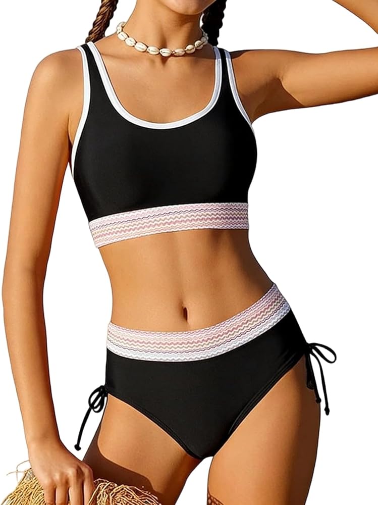 Teen Girls Swimsuits: This girls' bikini set features a trendy design with a U-shaped neckline, adjustable shoulder straps, removable chest pads, and high-waisted bottoms with drawstring detail and wave color block trim for a unique and stylish look.