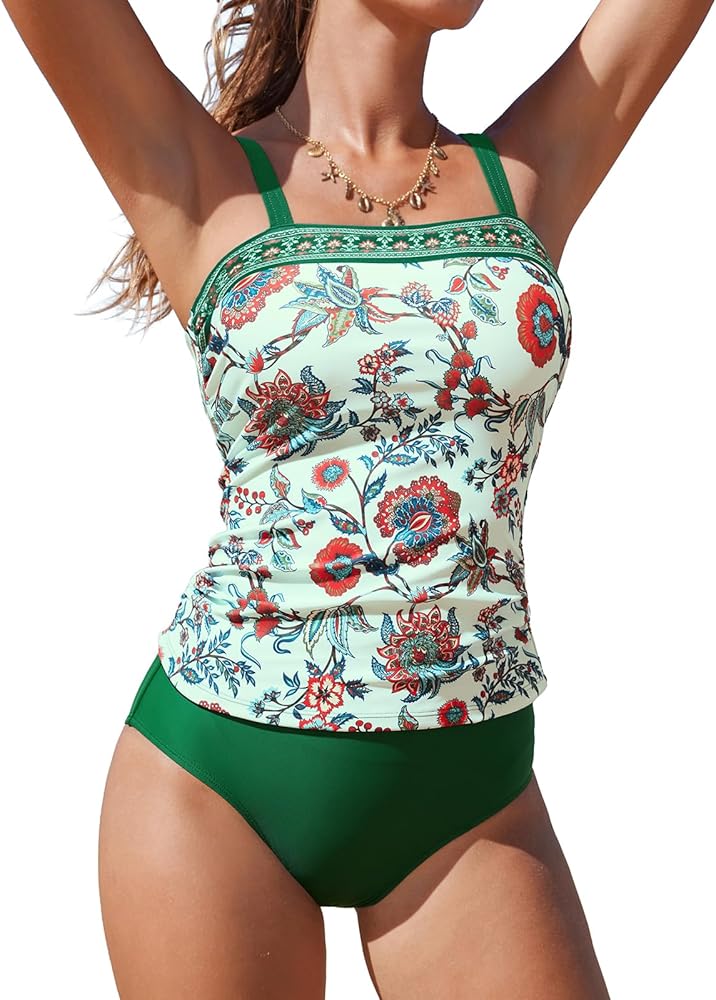 Design: The delicate floral tankini sets for women feature square neck and adjustable straps. Front ruched details are for tummy control. About Cup Style: With removable soft cups.