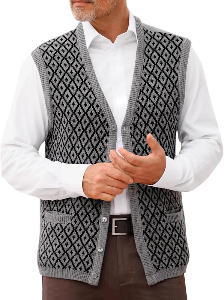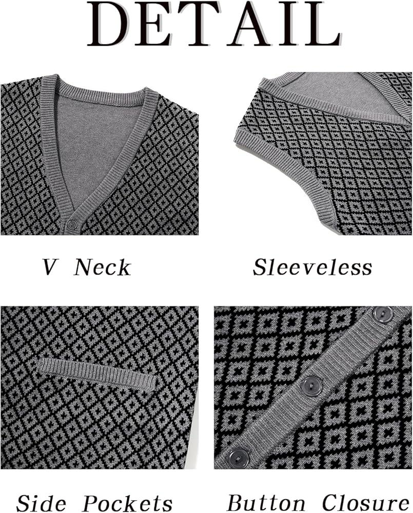 Features: Classic cardigan sweater features sleeveless, button closure, 2 open patch pockets, fashion argyle pattern, classic contrast color, regular fit, ribbed hemline. It the perfect wardrobe staple in spring, fall, winter, and other cold days