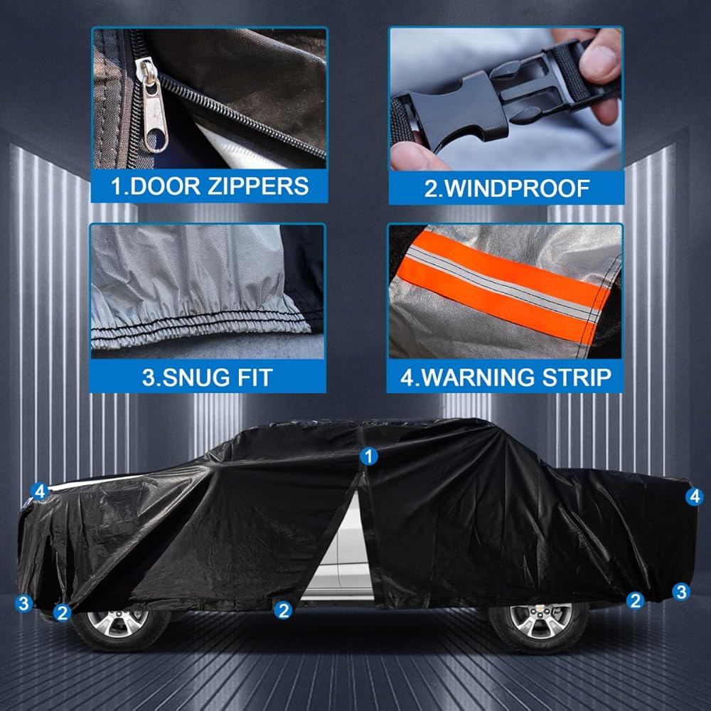 【Enhanced Design Features】1 Cab Zipper: Includes a driver's side zipper for easy access to the vehicle's cabin. 2 Double-layer Cotton Interior: Effectively protects your car's paintwork. 3 Reinforced Wind Straps: Three straps located at the front, middle, and rear of the vehicle can withstand winds up to 9 on the Beaufort scale.