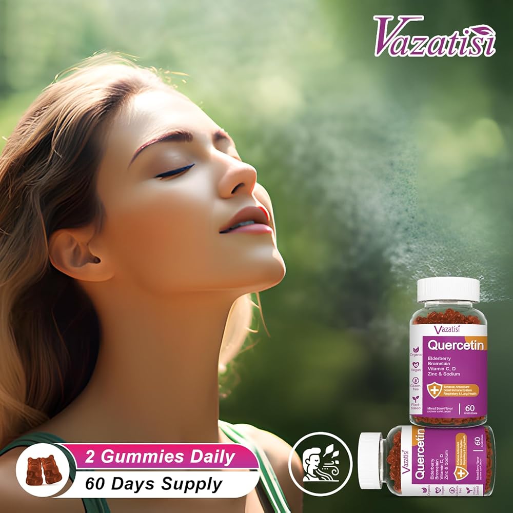 7- in-1 Advanced Formula, Maximize efficacy: Per serving quercetin gummies contain quercetin with elderberry, bromelain, vitamin C, zinc, Vitamin D and Sodium. Just 2 gummies a day of Vazatisi quercetin supplement can help support your overall well-being