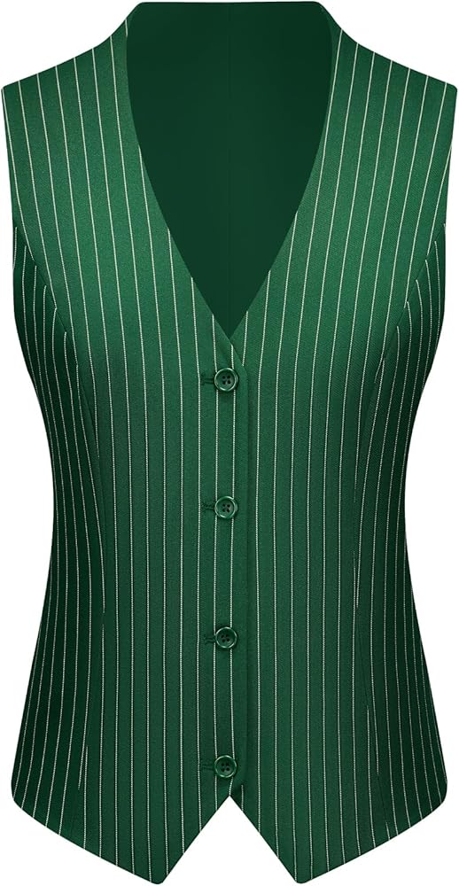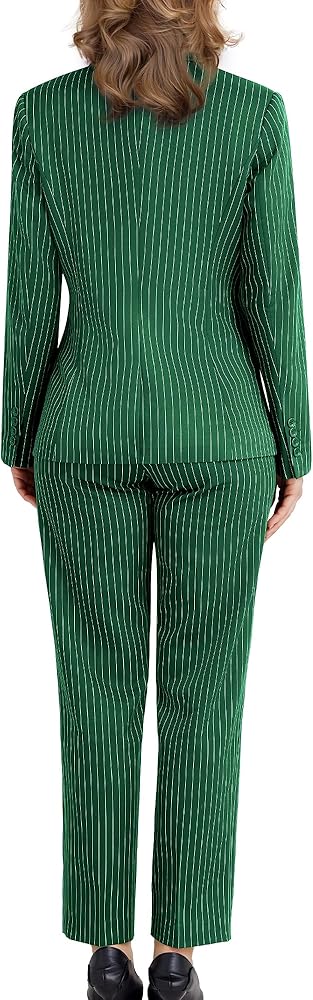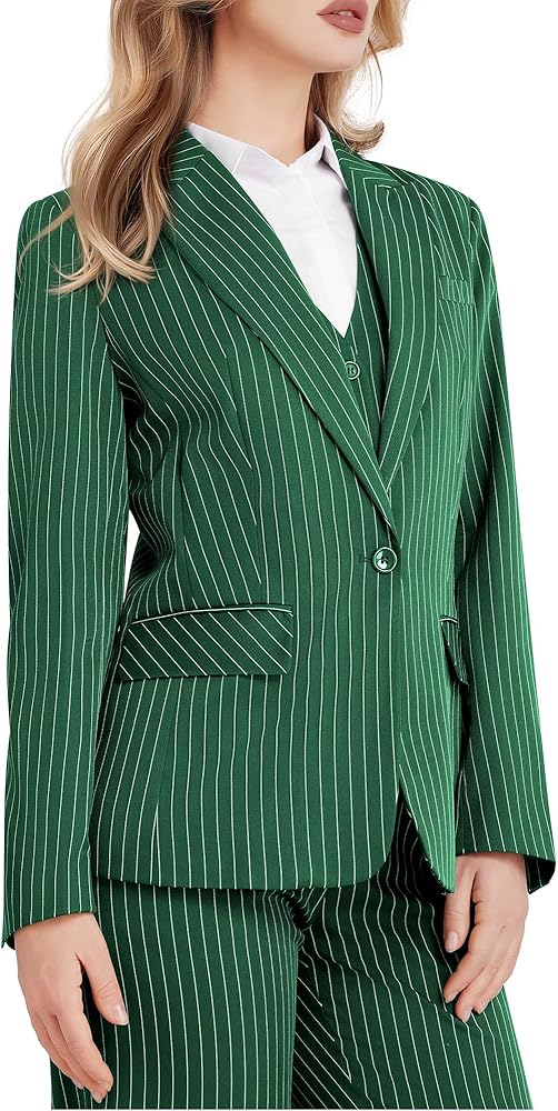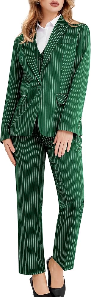 Classic Striped Design: The Kelyaa Women's 3 Piece Striped Suit Set features a one-button blazer with a sharp peak lapel, single back vent, one chest pocket, and two side flap pockets. The V-neck vest includes a four-button closure and two side pockets, while the tailored pants offer a flat front, zipper fly, button closure, adjustable waist, and two front slant pockets. The timeless pinstripe pattern exudes sophistication, making it a perfect addition to your professional wardrobe