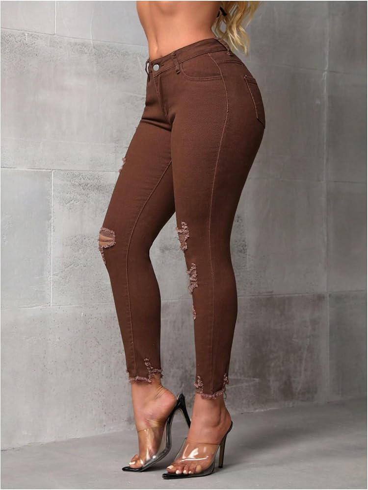 - Features: the skinny jeans denim pants features with mid waisted, button, solid color, ripped distressed, frayed trim