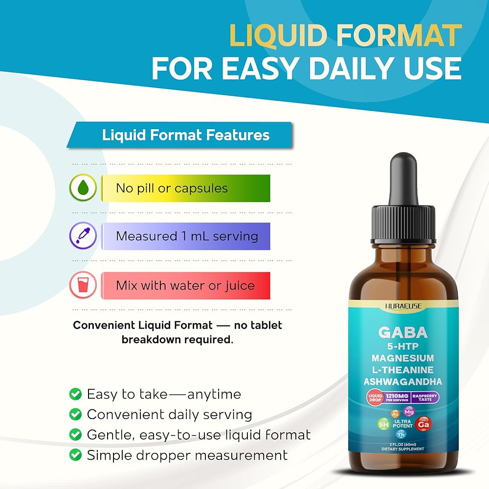 Liposomal GABA, 5-HTP, Magnesium, Theanine, Ashwagandha Liquid Drops – Ultra Potent, Raspberry Taste – 2 FL OZ (60ml)