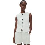 This deep blue vest is designed in a structured, curved silhouette and features a round neckline, row of black button closures, and front pockets.