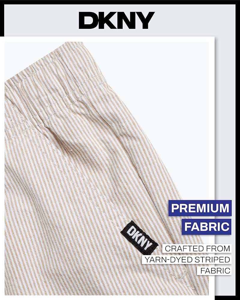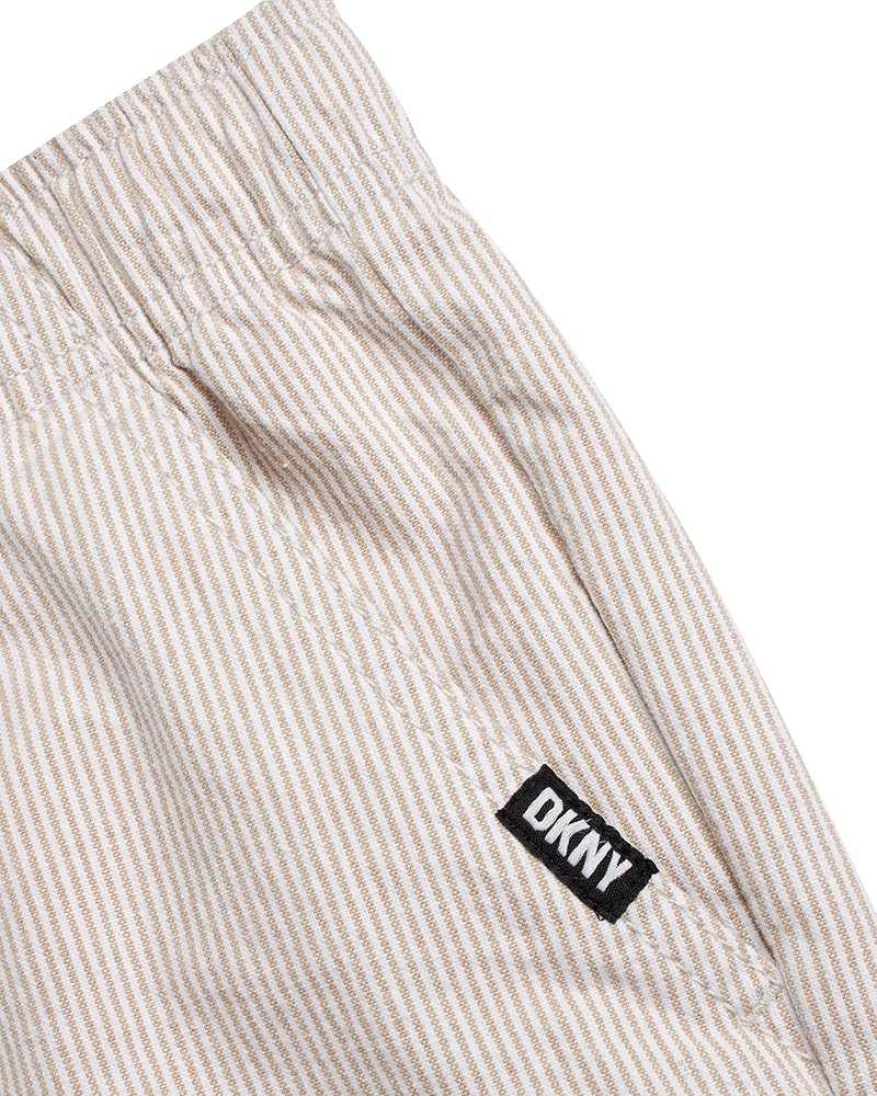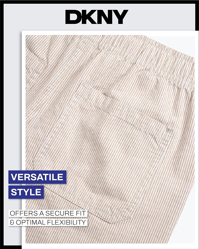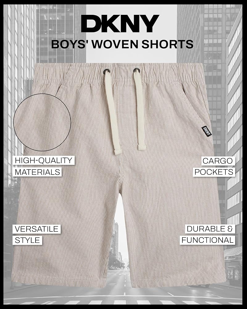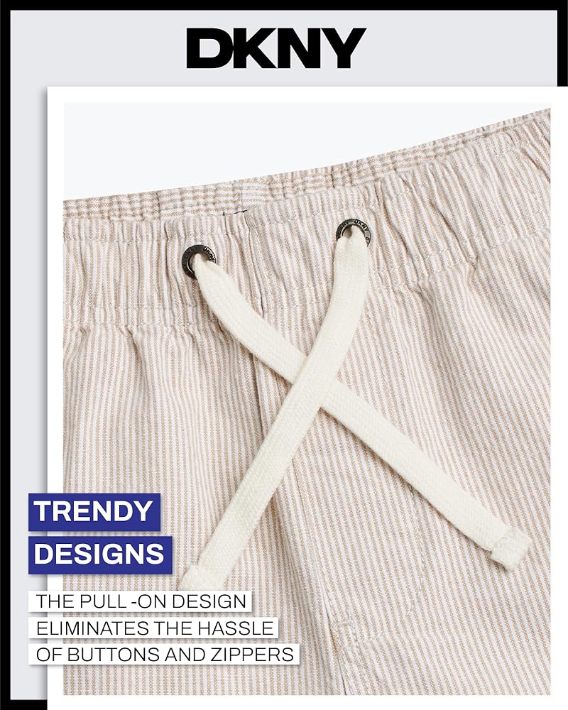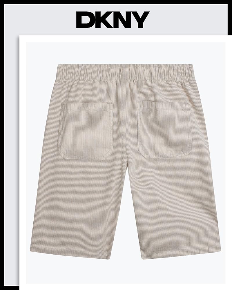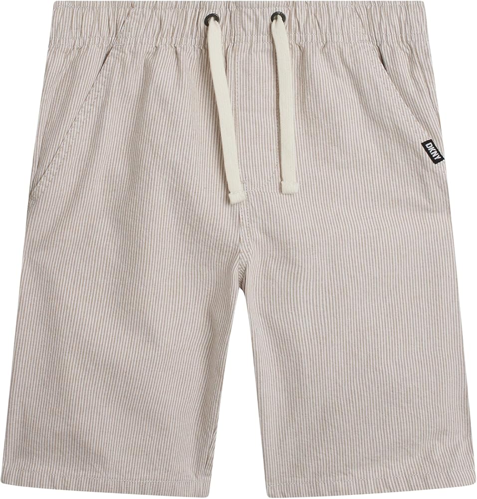 Give your boy's wardrobe a serious style upgrade with these DKNY Pull-On Woven Stripe Shorts - the kind of go-to piece that makes getting dressed easy, fun, and effortlessly cool. Whether he's headed to school, out for the weekend, or just doing his thing around the neighborhood, these boys' shorts are built for comfort and confidence in motion. Crafted with a soft, breathable woven fabric and finished with clean vertical stripes, these shorts bring polish to everyday boys' clothes without sacrificing movement. The pull-on waistband is all about ease - it flexes with him, adjusts with a drawcord, and keeps things secure without zippers or buttons slowing him down. It's just one more reason these belong in the regular rotation of boys summer outfits. Pockets? Covered. These aren't the tiny, decorative kind - they're real, functional side pockets that can handle treasures, trinkets, or just a pair of busy hands. Cut to land just above the knee, the tailored fit keeps things relaxed but sharp, ready for anything from family brunches to casual playdates. What sets these apart in boys' fashion is how effortlessly they blend comfort and versatility. They're designed for active days but styled to look just a little more dressed up - great for when sweat shorts feel too casual, but denim or chinos are too stiff. Whether you're shopping for your son, your grandson, or a nephew who's hard to please, these kids shorts deliver on every front. Parents will love how low-maintenance they are - machine washable, color-holding, and ready for repeat wear without losing their shape. Boys will love how they feel and look. That's a win-win for everyone. DKNY brings modern boys' clothes that actually work for real life - and these stripe shorts are no exception. Add them to your kid's lineup and watch them become the pair he reaches for again and again.