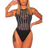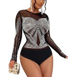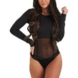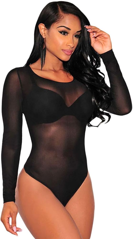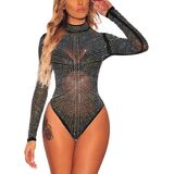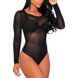 FEATURE: See through bodysuit, Sheer mesh bodice(Bra is not included), Silver studded design, Thong bottom with snap button gusset, Center back hidden zipper, Mock neckline, Long sleeve, Stretchy, Bodycon fit, show your curvaceous silhouette and add unexpected sexiness to your everyday look
