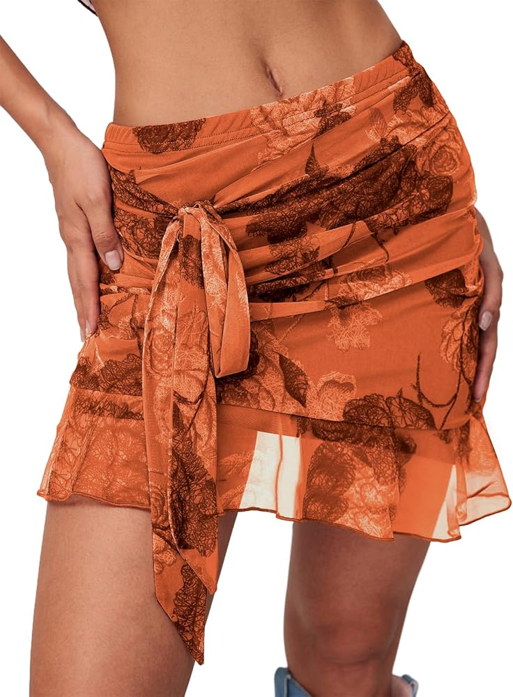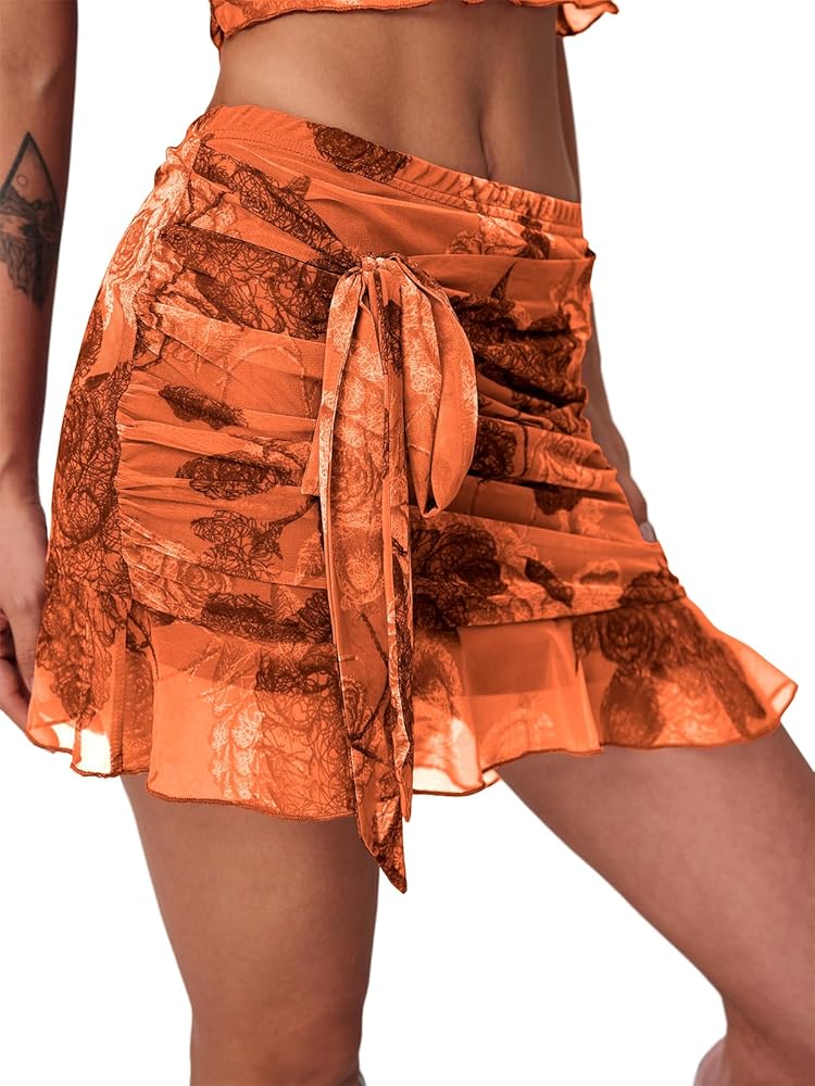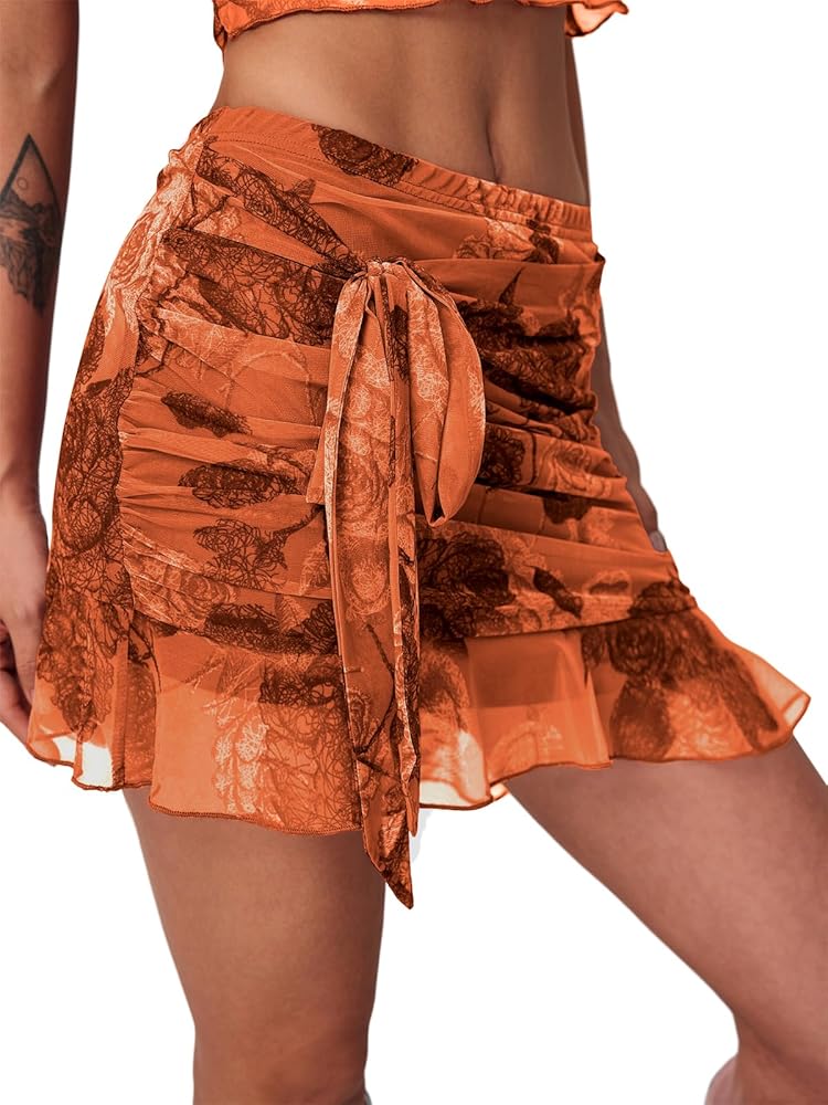 This short ruffle skirt features a flattering pencil style,ruffled hemline and delicate floral print allover;The high waist and ruched detailing on the side creates a flattering silhouette;The elastic self tie waist allows for a customizable fit,ensuring you stay cozy throughout the day