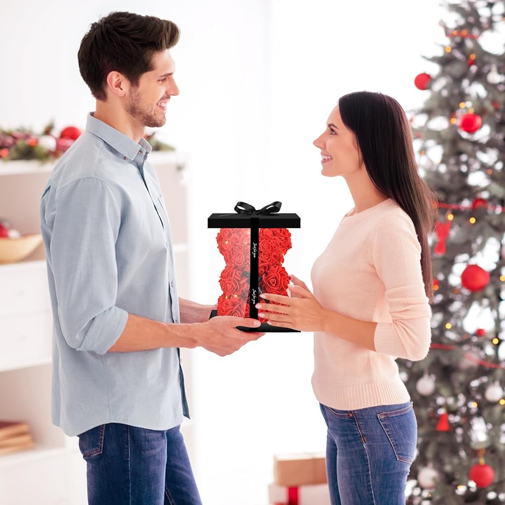 [Cute and Handmade] Cute bear shape design, handmade from nearly 200 artificial roses flowers and placed in a highly transparent gift box to display the rose bear all around. Note: The protective film on the gift box can be removed for better lighting effects