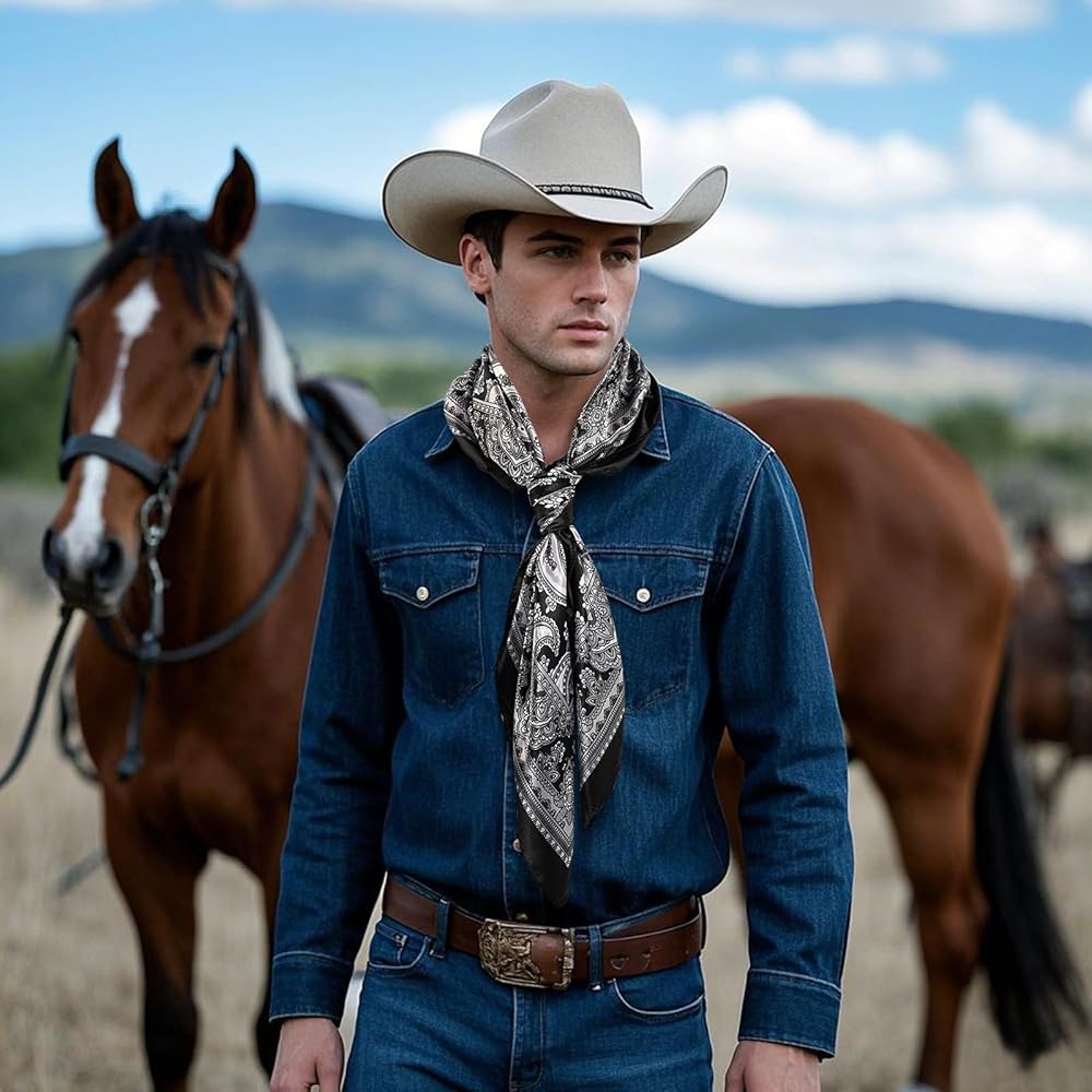 Style: Western scarf is vintage cowboy style with diverse colors, can meet different matching needs and personal preferences, showcasing personality and fashion. Mens cowboy bandana designed with the paisley pattern and cashew flower pattern. It's very exquisite and has a strong visual appeal.