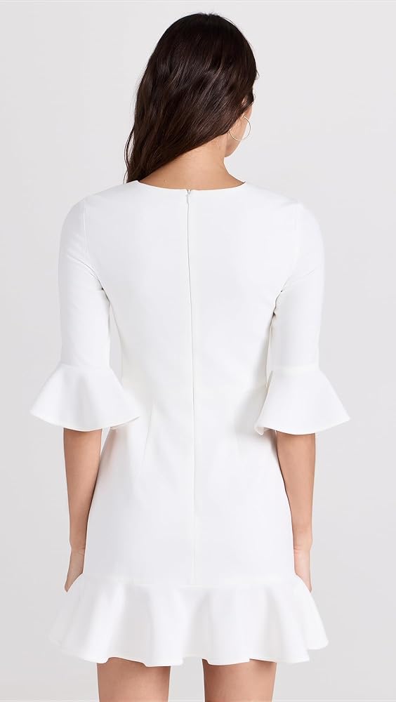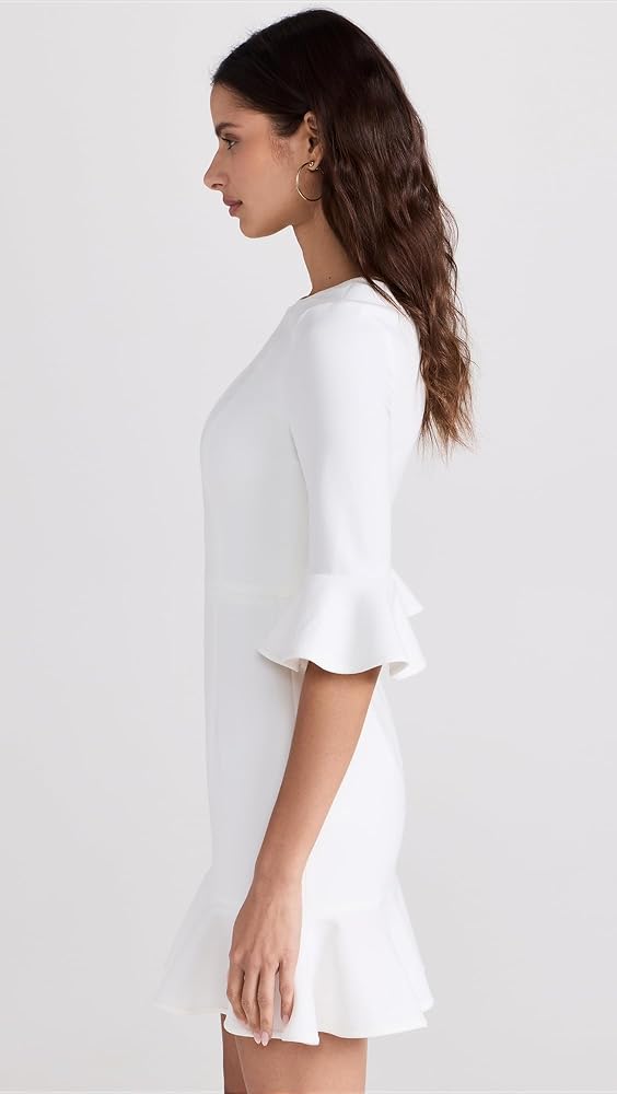 Crew neck dress features 3/4 sleeves with ruffle cuff and ruffle hem