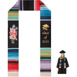 Exquisite Mexican Graduation Stole: This Mexican graduation stole class of 2025 are designed with Mexican Element style and graduation elements in colorful, including floral on one side, graduation cap, class of 2025 writing on other side, which is elegant and beautiful, can enhances your graduation gown in graduation party
