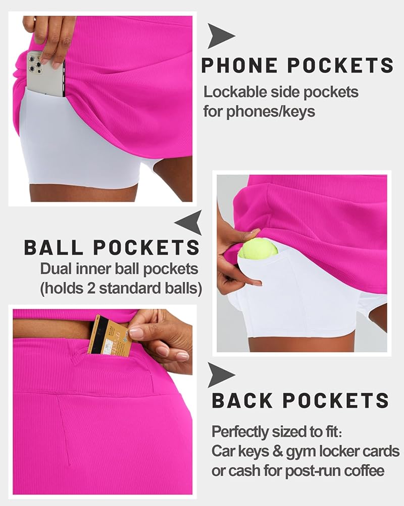 【BUILT-IN SHORTS WITH SMART POCKETS】No more awkward adjustments! Our tennis skort with built-in shorts features:✅ Ball pockets for easy access mid-game ✅ Side drop-in phone/keys pockets (fits phones up to 6.7",say goodbye to bulky bags!)✅ Elastic high-rise waistband that stays put during intense moves.Perfect for tennis drills, trail runs, or gym workouts – keep essentials secure without breaking stride.